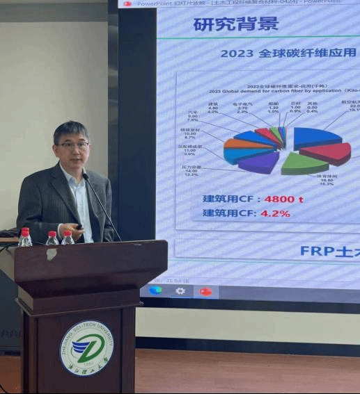 咸贵军教授作题为“先进土木工程纤维复合材料及其应用研究”的报告,从先进土木工程纤维复合材料的研究背景出发,介绍了碳纤维复合材料加固钢管道、热塑性复合材料筋、FRP 耐久性研究等方面的研究成果,认为FRP土木工程应用是土木工程与纤维复合材料的重大机遇。