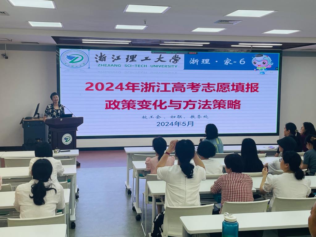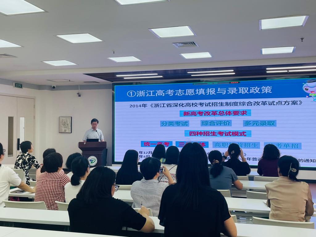 十年寒窗,只待一朝。为积极落实“我为群众办实事”,帮助广大教职工全面了解2024年浙江省高考志愿填报与录取政策、志愿填报策略等,助力孩子如愿进入心仪高校,5月23日中午,由校工会、妇联,教务处联合组织的《浙江高考志愿填报政策变化与方法策略》辅导讲座在下沙校区2N115致远厅举行,临平校区L4—416教室开启同步直播。两校区共吸引了近五十位教职工家长参加,讲座由校教务处副处长、继续教育管理中心主任高建明主讲,校工会、妇联常务副主席张信群主持。