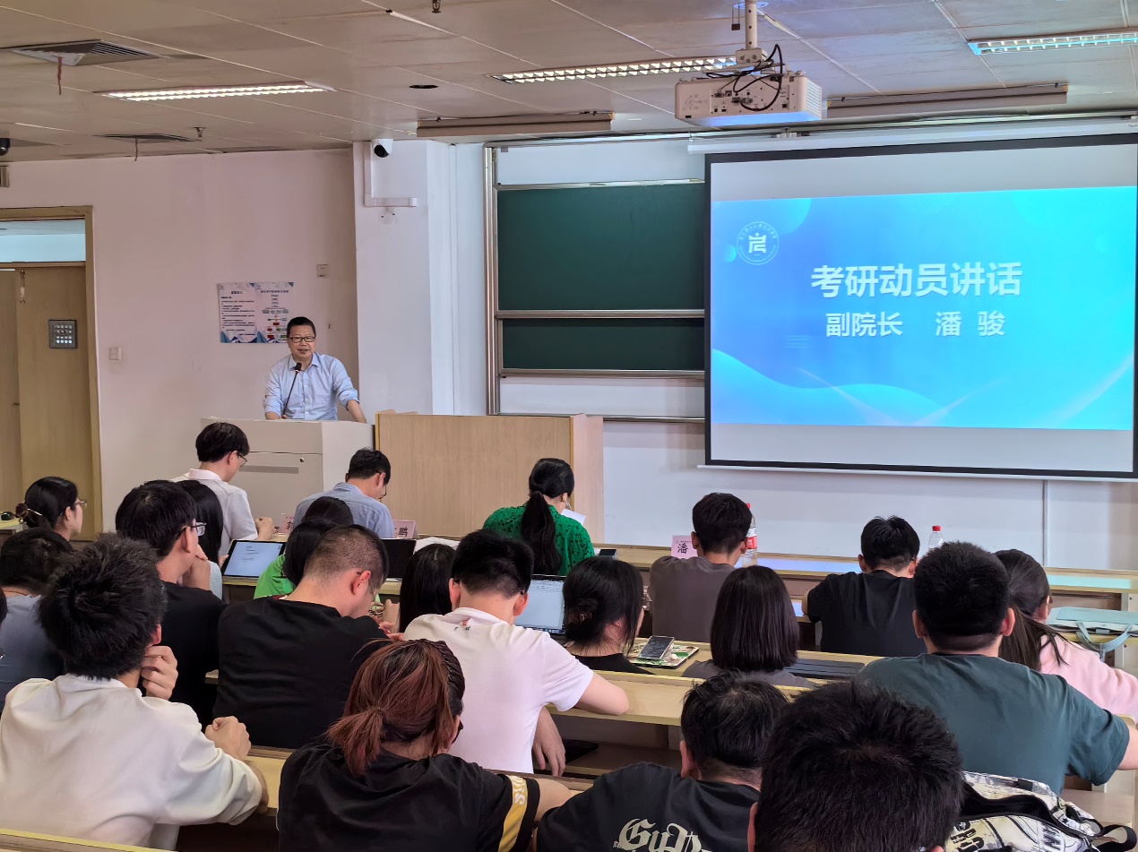 潘骏作考研动员讲话,他围绕“趁早、专注、坚持、策略”四个关键词,分析了当前的考研形势,指出考研不仅能够提升同学们的专业素养和综合能力,还能够增加更多就业的选择和机会。他希望同学们要提前准备、足够投入、贵在持续、结伴同行,同时鼓励同学们充分利用好各类资源,坚定信心、加强锻炼,确保高效地学习,成功上岸。