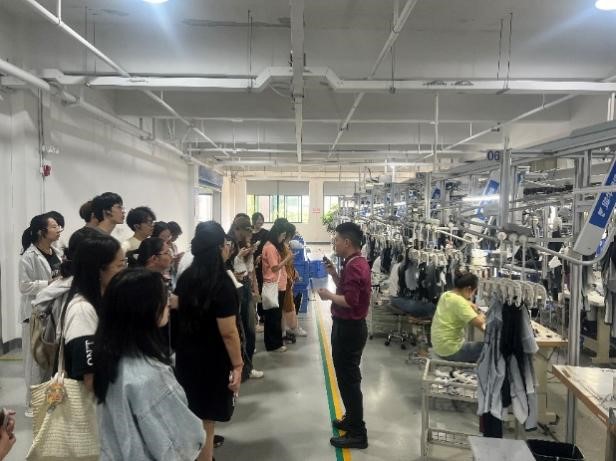 随后,同学们参观了车缝车间,犀牛智造通过效率曲线直观的反应进行小单快反维持制作效率的必要性,该车间运用混款吊挂系统,实现“一片衣片不落地、全链条要素流动”,数字机械和人工制作的融合大大提高了生产效率,同学们更加了解了新技术产生的新生产模式。