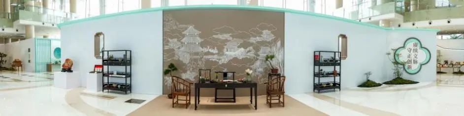 本次历史经典产业精品展以青、绿、蓝为主色调,极具江南韵味的漏窗设计与饱含浓郁古典气息的经典产品碰撞在一起,呈现出了一场美学盛宴。这次的精品展以“文化+”作为策展主线条,以宋韵设计为灵感,按照6个板块来展示产业的全貌和发展成果,与商贸型展会不同的是,本次精品展更多地侧重于历史经典产业文化的展示和传播;精品展上,全省50多家民族品牌和龙头企业带来了一百多款产品。