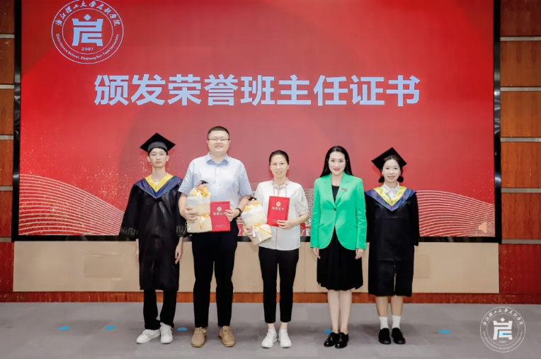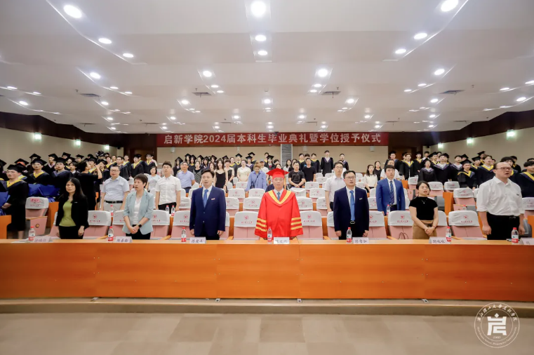 学位授予仪式后举行学院“一‘启’向未来”2024届本科生毕业典礼。学院党委书记吕媛媛为荣誉班主任颁发证书。副院长潘骏为各班获得启新“荣誉学员”的学生颁发了荣誉奖杯。