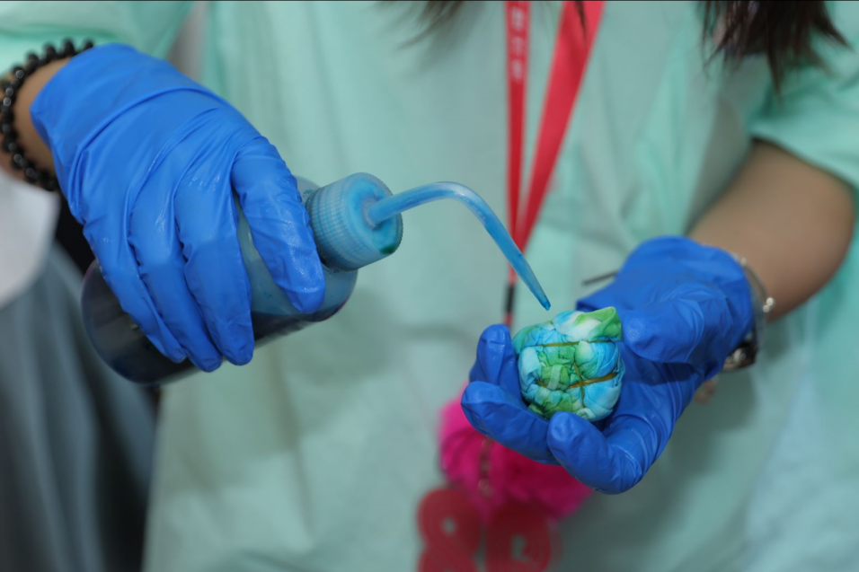 同学们进行了扎染研学和白T恤改造设计研学,在张奕老师和周伟老师的带领下动手制作了自己的设计作品。