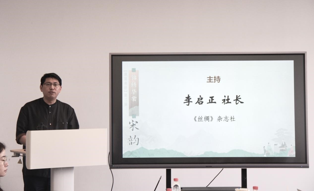 启动仪式之后,《丝绸》杂志社社长李启正主持了“宋韵服饰创新设计研讨会”。李社长介绍了此次研讨会演讲嘉宾,并对《丝绸》期刊的创办和发展现状作了介绍。《丝绸》是丝绸(纺织)领域办刊历史悠久、影响力大且具权威性的专业期刊,也是国际丝绸联盟和中国丝绸协会的会刊。李社长提到,在本次大赛决赛环节,将评选出一定数量的优秀设计作品,选登在《丝绸》杂志当中,期待各位选手们后续精彩的服饰复原和创新设计。