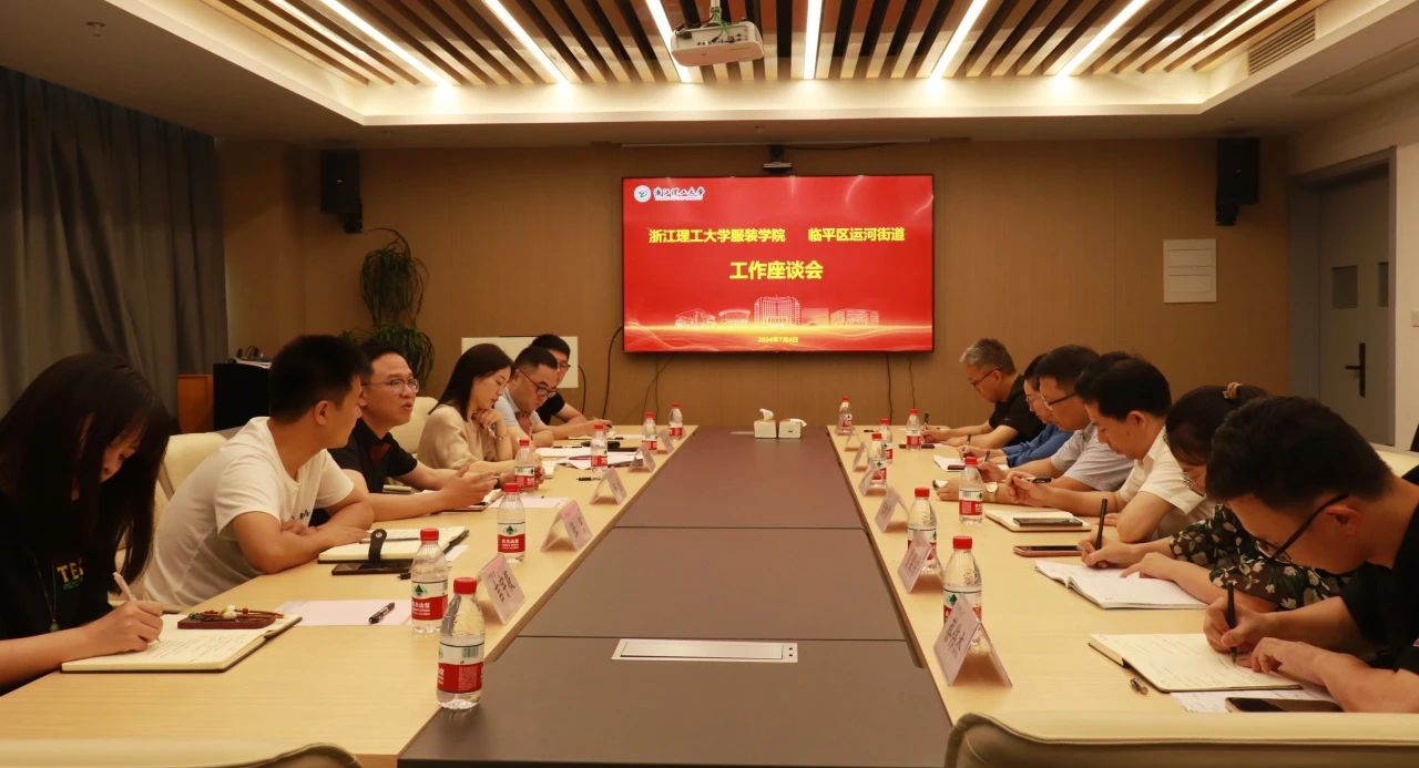 为进一步推动校企地一体联动和产学研深度融合,激发大学生创新创业活力,写好属地融合文章,7月4日,运河街道党工委书记陈杭,党工委委员郭丽萍、张宇,运商投资有限公司董事长、运河1986文创园负责人沈卫东等一行来服装学院开展工作座谈会。服装学院党委书记熊杰,副院长冯荟,党委副书记、纪委书记胡永青,艺术与科技系教师、临平区文化特派员岑科军,学工办主任、团委书记贾梨淙等参加了交流座谈。