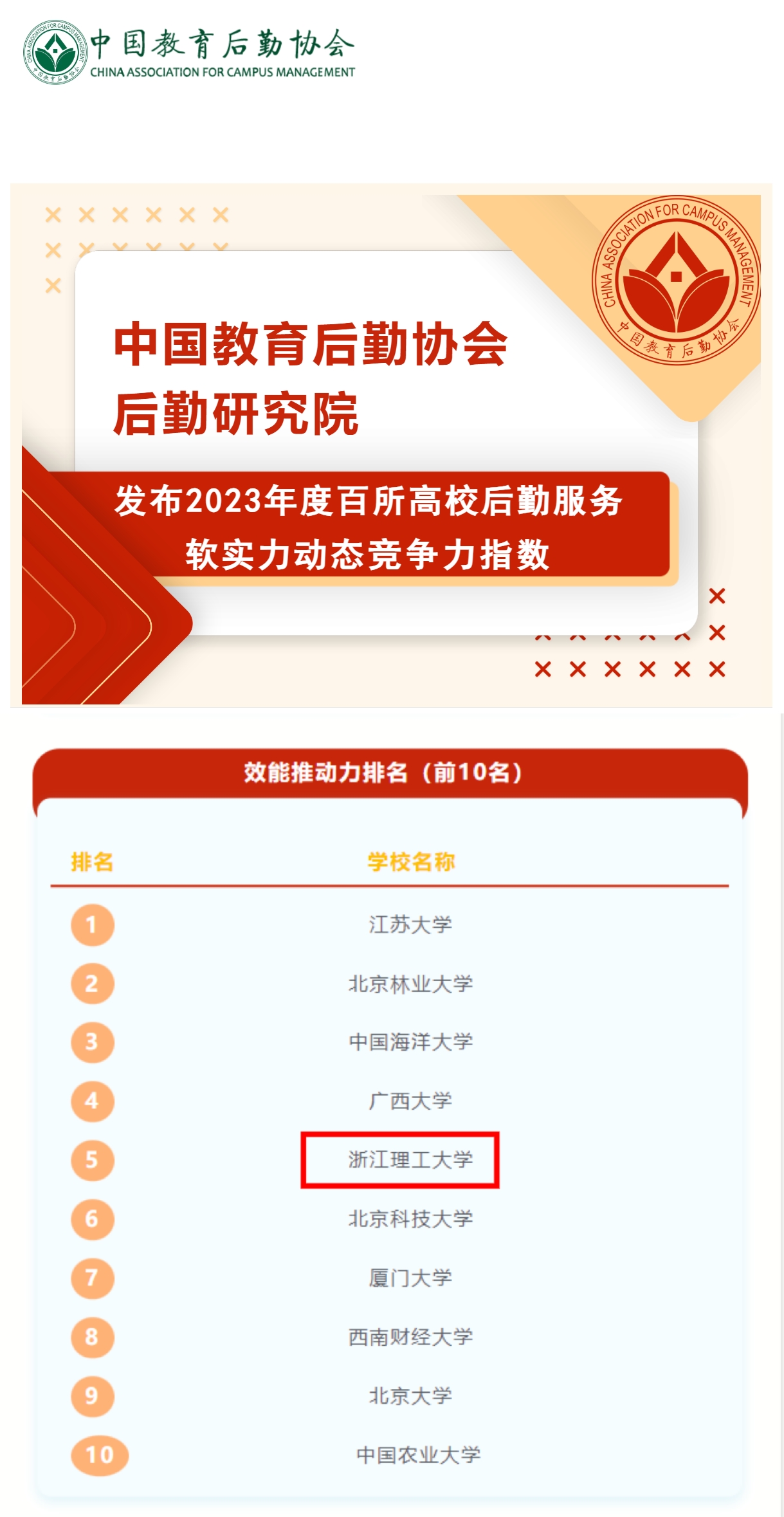 近日,由中国教育后勤协会后勤研究院主办的“2023年度百所高校后勤服务软实力动态竞争力指数”发布,我校效能推动力排名全国第五。