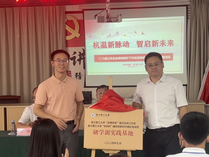 周照东、林海鸥为浙江理工大学“浙理青享”理论宣讲工作室、浙江理工大学“8090”理论宣讲团研学训实践基地揭牌。
