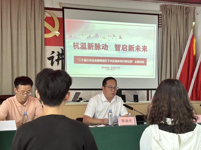 陈迪光致欢迎辞,他围绕“山水楠溪江,发展枫林镇”,重点讲述深化改革背景下枫林镇的奋进历程与发展成就,回顾枫林镇与浙江理工大学的合作,希望以此次活动为契机,推动校地协同向更深层次迈进。