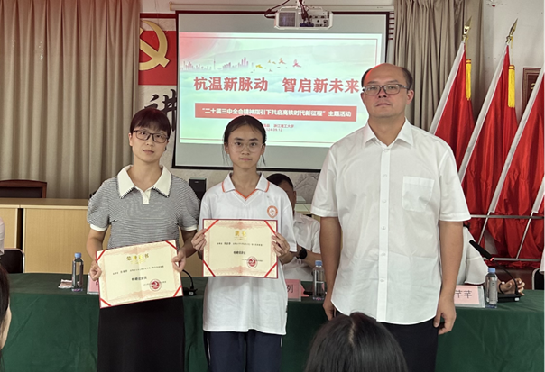 胡琦为陈缘茜、徐嘉静颁发浙江理工大学、延安大学“红传联盟”特聘宣讲员证书,未来,大中小将继续携手共进,纵深推进大中小思政课一体化融合开展。