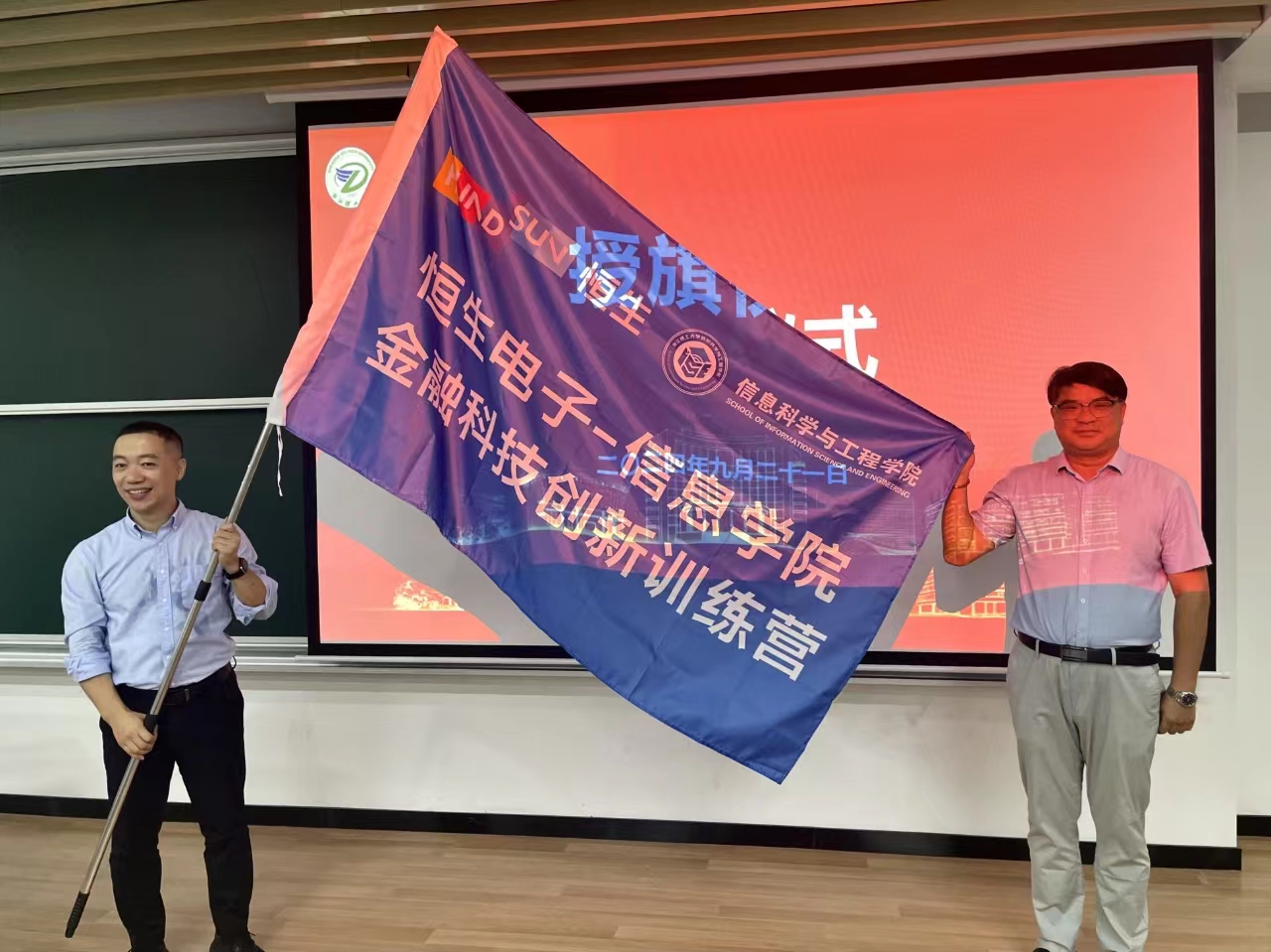 随后,张一嘉为恒生电子-信息科学与工程学院金融科技创新训练营授旗。