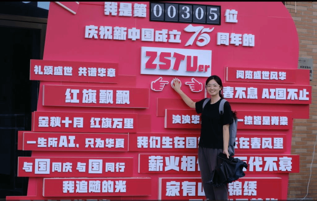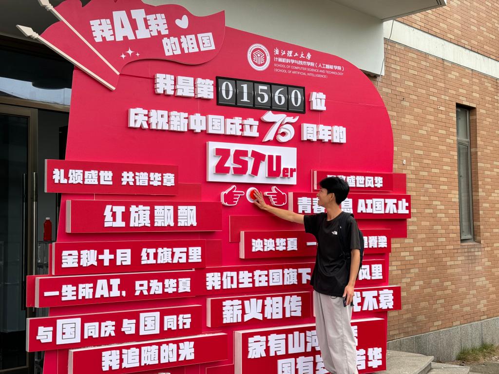 近日,在新中国成立75周年之际,计算机科学与技术学院(人工智能学院)东门,一个大型机械翻页造型装置成为了校园内最引人注目的地标。“以‘AI’之名在‘浙理’为祖国点赞”,这不仅是一次简单的互动体验,一曲对祖国的深情赞歌,更是一场沉浸式的爱国教育。它象征着历史的翻页,也预示着未来的篇章,激发了学生们的爱国热情和集体荣誉感。