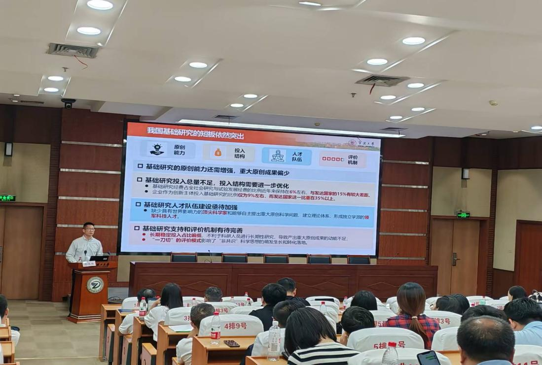 孙伟伟作题为“构建有组织科技创新体系助推宁波大学基础研究高质量发展”的主题报告。他从我国基础研究面临的新形势、宁波大学科技创新体系探索、宁波大学国家基金管理实践等三个方面,向在场听众分享了宁波大学在国家自然科学基金等方面的管理经验。他指出,要加强高级别成果培育力度,加强重大标志性项目的谋划,加强学科交叉、提升科研创新能力,加强精准服务、提高项目申报质量。