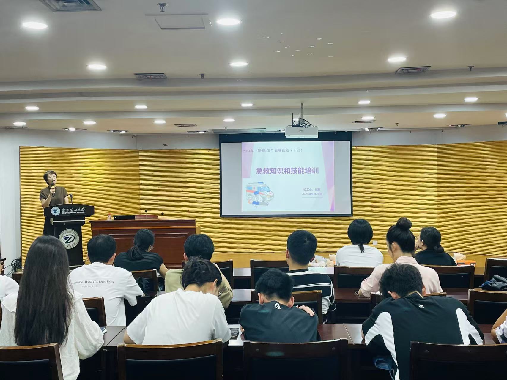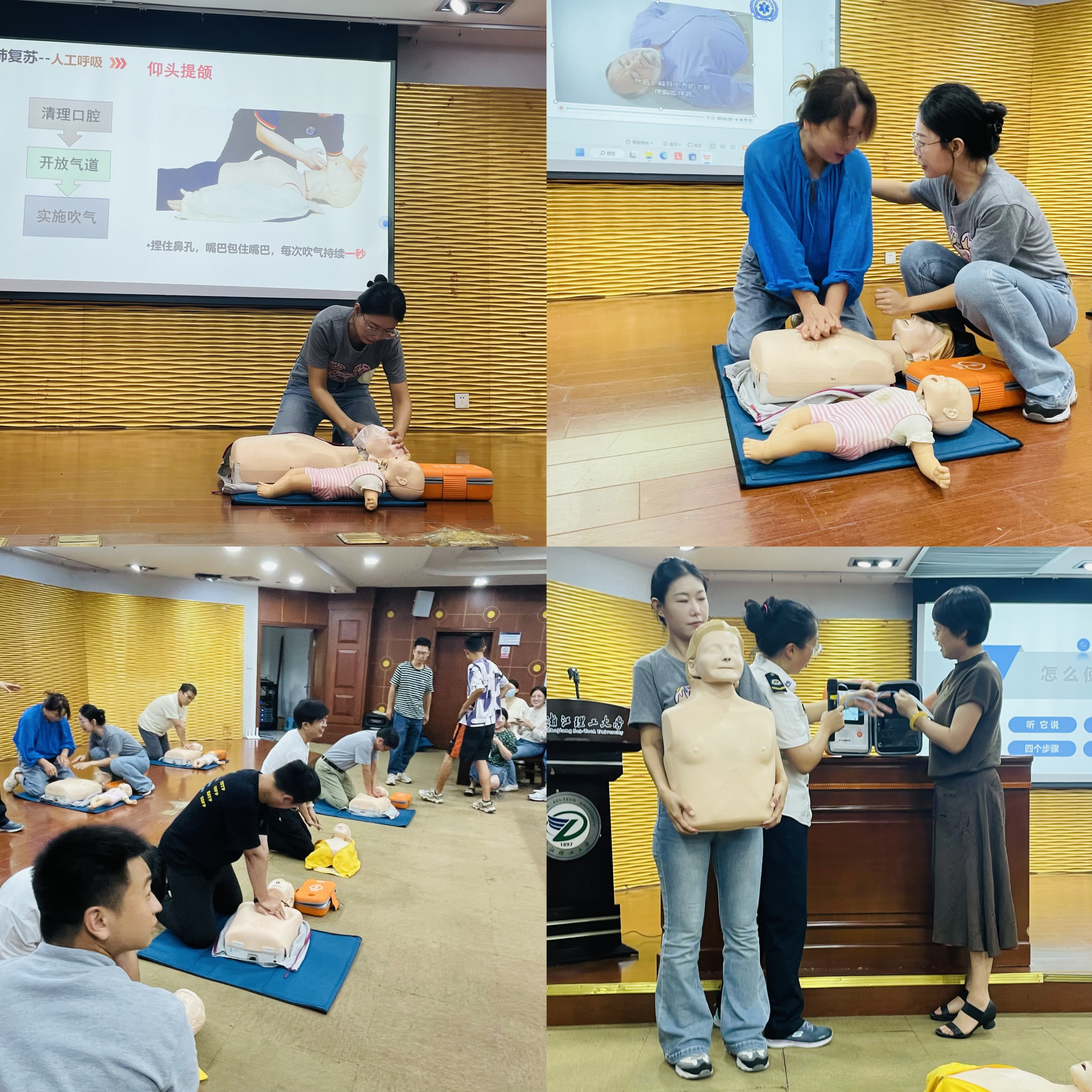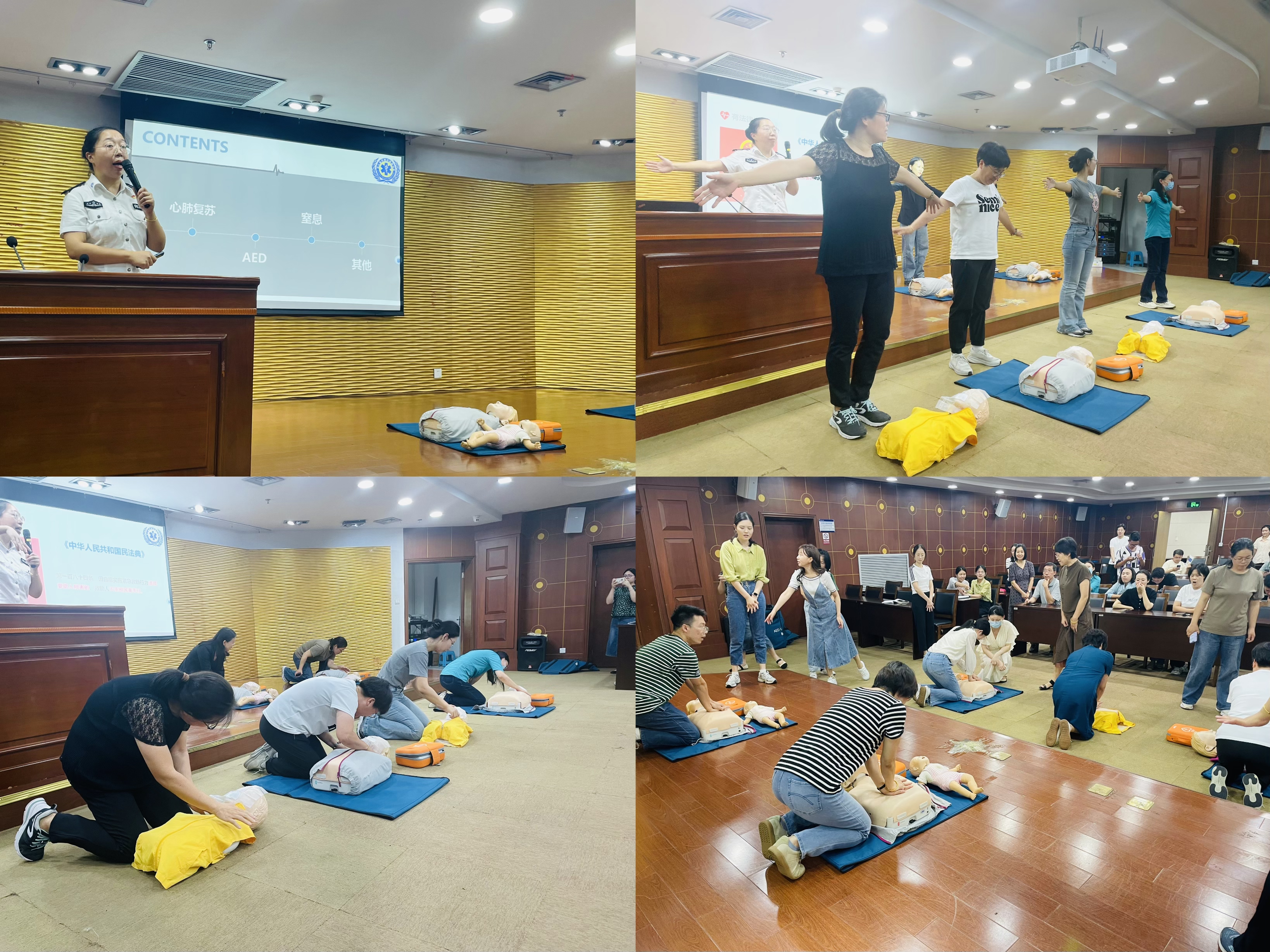 9月26日中午,由校工会、妇联主办,校医院承办的急救知识和技能培训在行政楼一楼报告厅如期举行。杭州市急救中心AHA导师、公众培训导师、资深院前急救医生杨潇受邀主讲,浙江省中医院钱塘院区急救创伤中心院前120急救医生朱李娜现场做实操指导,60余位教职工参加培训。