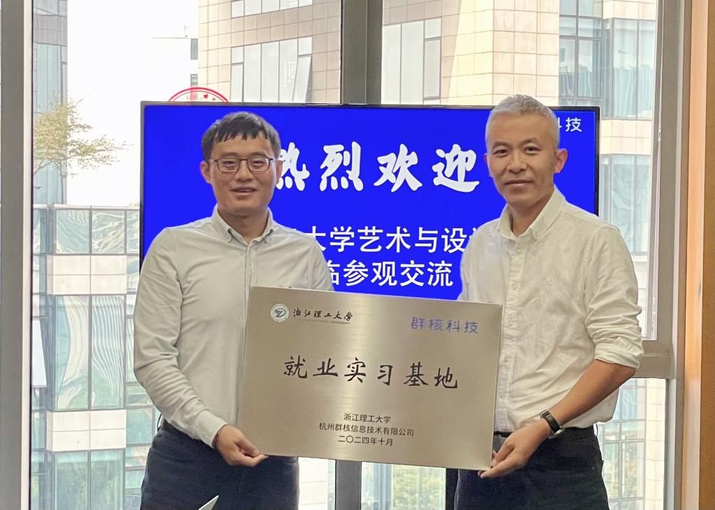 艺术与设计学院积极推进校企供需对接就业育人工作,群核科技(酷家乐)联合创始人兼CTO朱皓与艺术与设计学院副书记贾立壮为校企实习基地授牌。