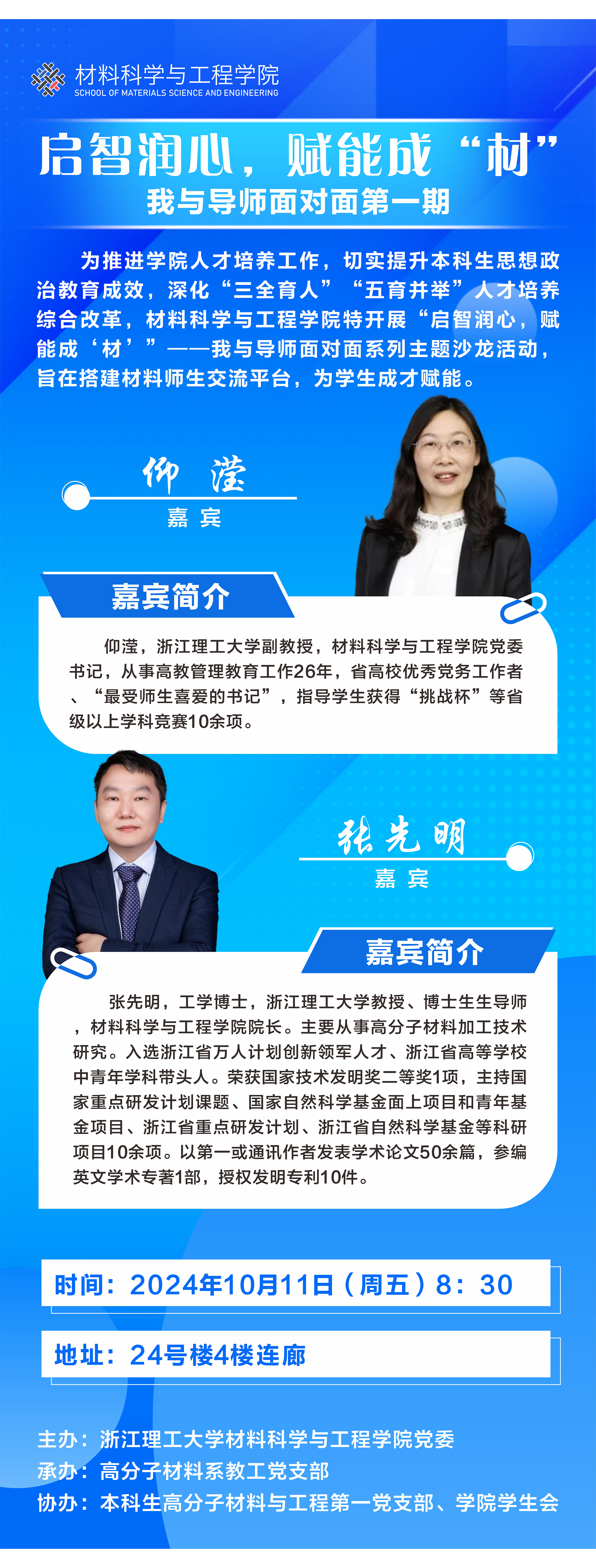 “启智润心,赋能成‘材’”——“我与导师面对面”系列主题沙龙活动由学院党委主办,由全国党建工作样板支部——高分子材料系教工党支部承办,本科生高分子材料与工程第一党支部、学院学生会协办。