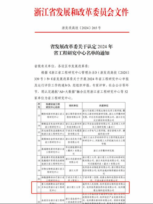 10月22日,浙江省发展和改革委员会发布了《省发展改革委关于认定2024年省工程研究中心名单的通知》,由生命科学与医药学院牵头申报的“重大疾病靶向治疗新技术和应用浙江省工程研究中心”成功获批。
