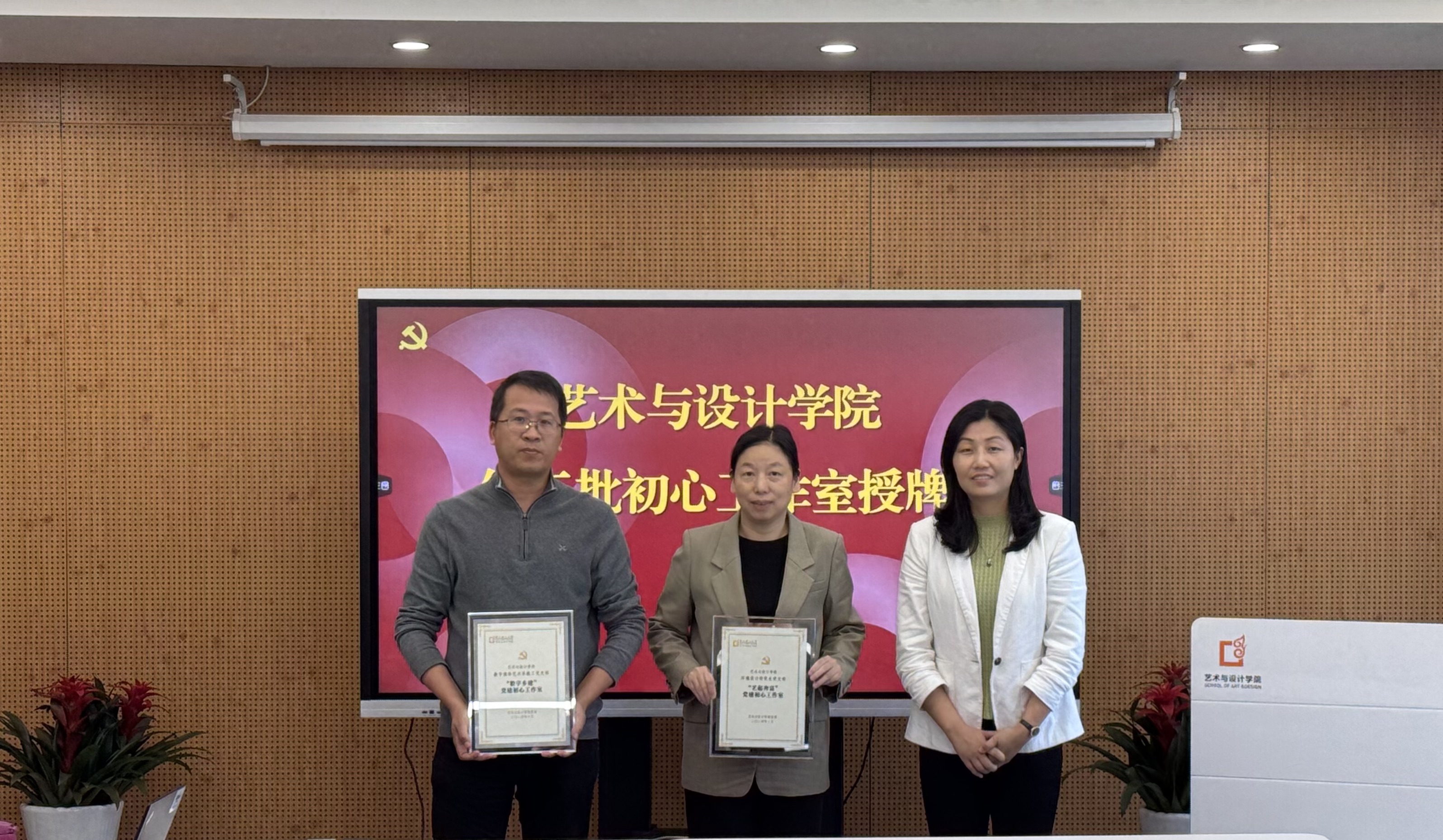 2024年,为持续推动党建与事业融合发展,学院党委开展了第三批党建“初心”工作室创建申报工作。会上,学院党委宣布“艺起奔富”环境设计研究生党支部、“数字乡建”数字媒体教工党支部成功获评学院第三批党建“初心”工作室创建名单。学院党委书记吕旻为第三批党建“初心”工作室党支部书记陈璐、陈峰授牌。