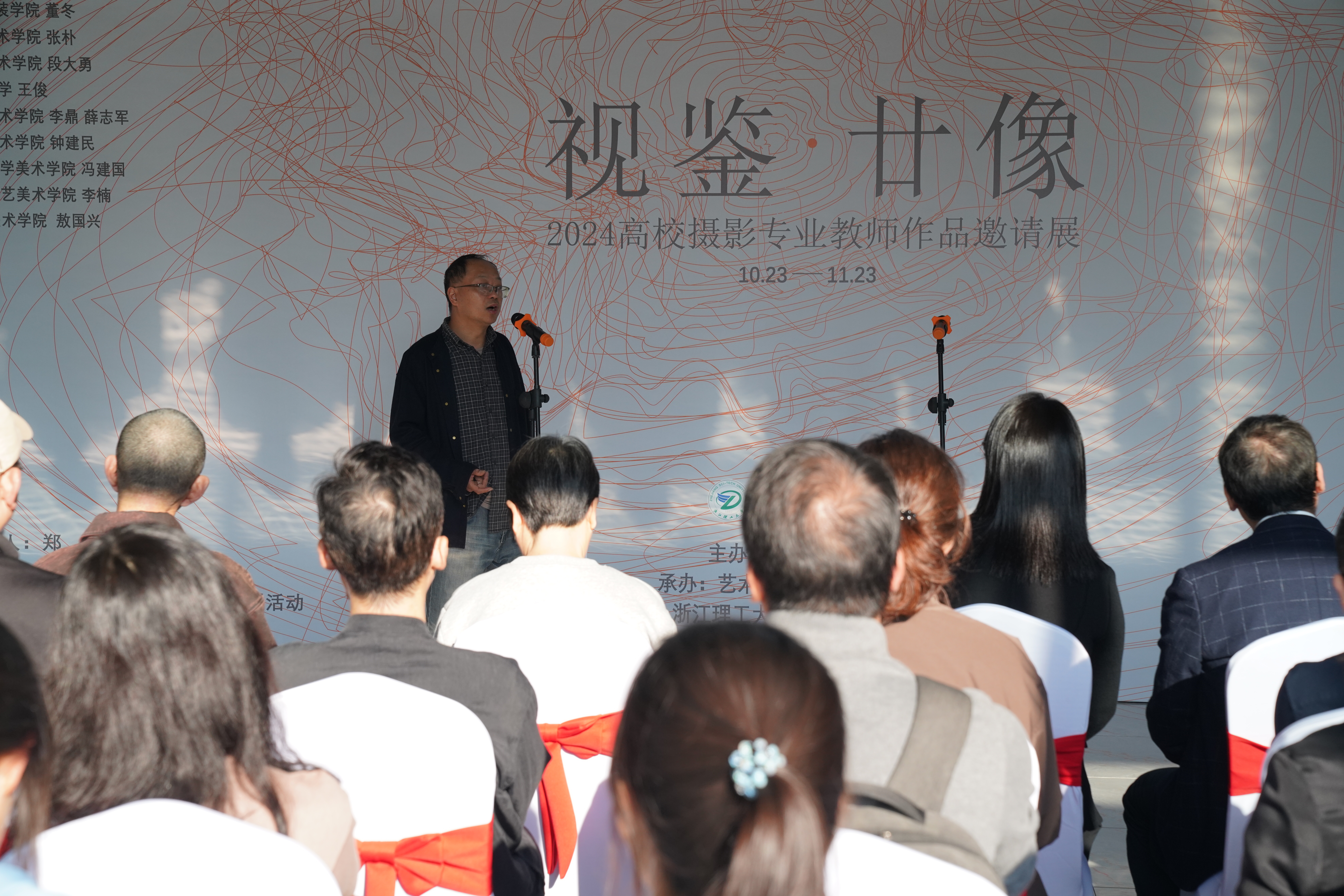 朱旭光教授提到,今年是艺术与设计学院建院20周年,二十载光阴流转,砥砺前行;二十载栉风沐雨,奋发进取。朱旭光教授代表艺术与设计学院向关心支持学院发展的校内外领导与各界朋友表示衷心的感谢!向为学科专业发展贡献绵薄之力的老师和同学们致以崇高的敬意!这次的高校摄影专业教师作品邀请展是主题为“视鉴·廿像”的艺术与设计学院建院20周年系列活动中重要的一环。从所展出的作品来看,朱旭光教授觉得这次摄影作品邀请展有三个特点:一是规模不大,规格很高。本次参展院校一共21所,涵盖了大部分国内重要的艺术院校。摄影是一门独特且具有多面性的视听艺术形式,本次展览的作品风格多样,有的捕捉瞬间记录真实,有的通过构图光线和色彩来营造美的氛围,本次摄影邀请展旨在搭建一个各校交流的平台,形成一个虚拟剧场,充分展现摄影之美,美在交流。二是总量不多,精品不少。摄影是光与影的艺术,光线是摄影的灵魂,创意是摄影的关键。各位参展艺术家善于观察运用自然光和人造光,通过对光线的强度、方向、颜色的把握,创新独特的创作视角,尝试新的拍摄风格,创造立体感,营造沉浸感,塑造主体性,凝练地展示摄影之美,美在创意。三是高朋满座,强手如林。各位参展艺术家都身负各种身份,是博导、硕导、教授,是中国金像奖获得者、国家艺术基金评委,同时大多是各个专业院校的专业带头人、优秀的专业教师。每幅作品都是摄影师调动手眼身法步进行具体创作的艺术,并将自己的思想、情感和体验融入作品,激发观众心神意念间的多维共鸣,集中呈现出摄影之美,美在意境。视鉴廿载,筚路蓝缕,浙理艺设,风华正茂。廿像纷呈,历历在目,桃李盈门,匠心筑梦。祝福艺术与设计学院春华秋实更迭,砥砺前行不辍。潜心磨剑励志,续写华章新篇。