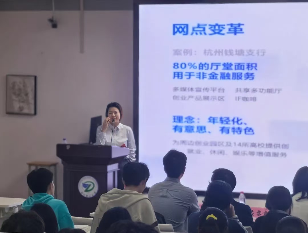 郑忆南介绍了泰隆银行的企业文化和服务理念,并欢迎同学们到泰隆银行钱塘支行交流与学习。