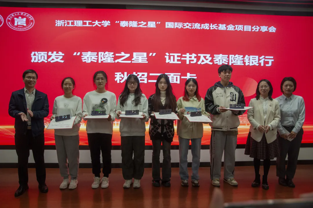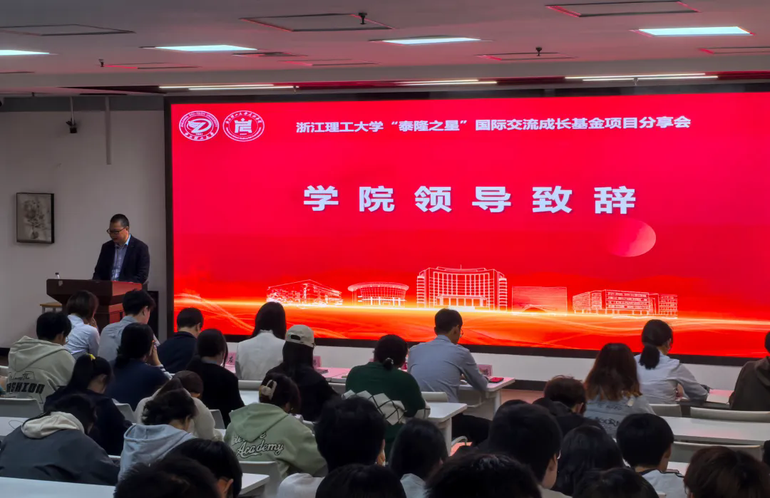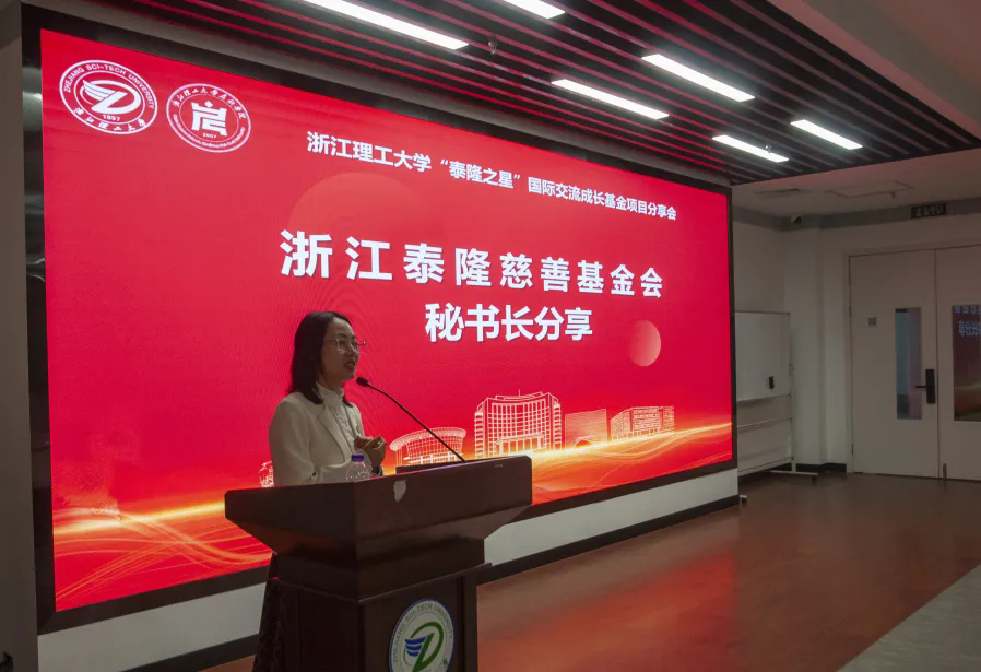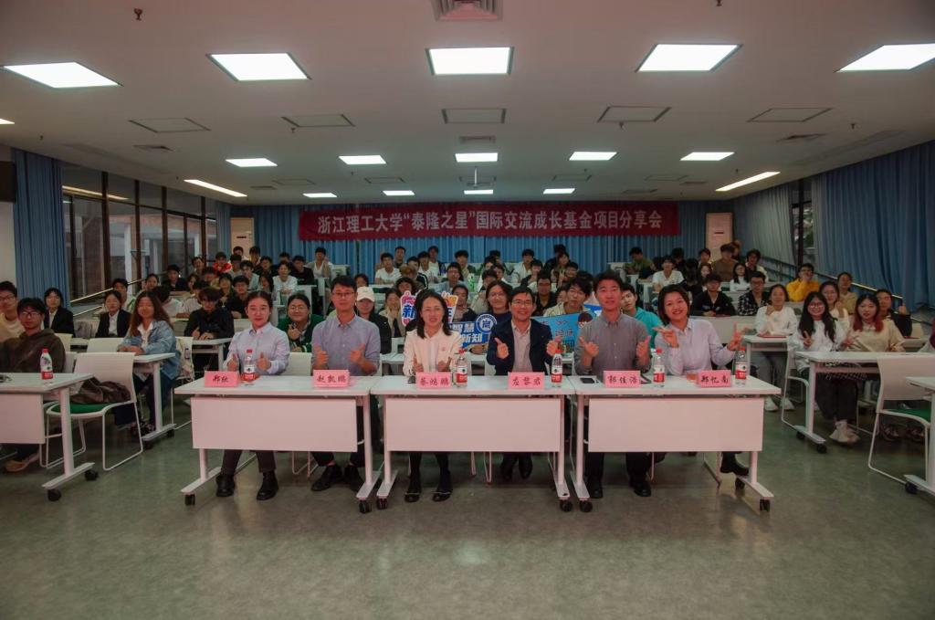10月30日下午,浙江理工大学“泰隆之星”国际交流基金项目分享会在2号楼致远厅举行。浙江泰隆慈善基金会秘书长蔡鸿鹏,项目经理郭佳浩,泰隆银行钱塘支行业务一部负责人郑忆南,客户经理郑欣,浙江理工大学对外联络办公室副主任应黎君,启新学院、创业学院副院长潘骏,党委副书记赵凯鹏,以及学院辅导员、“泰隆之星”国际交流基金获得者和学生代表出席仪式。