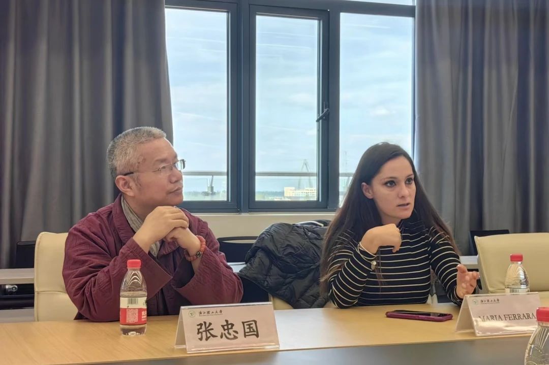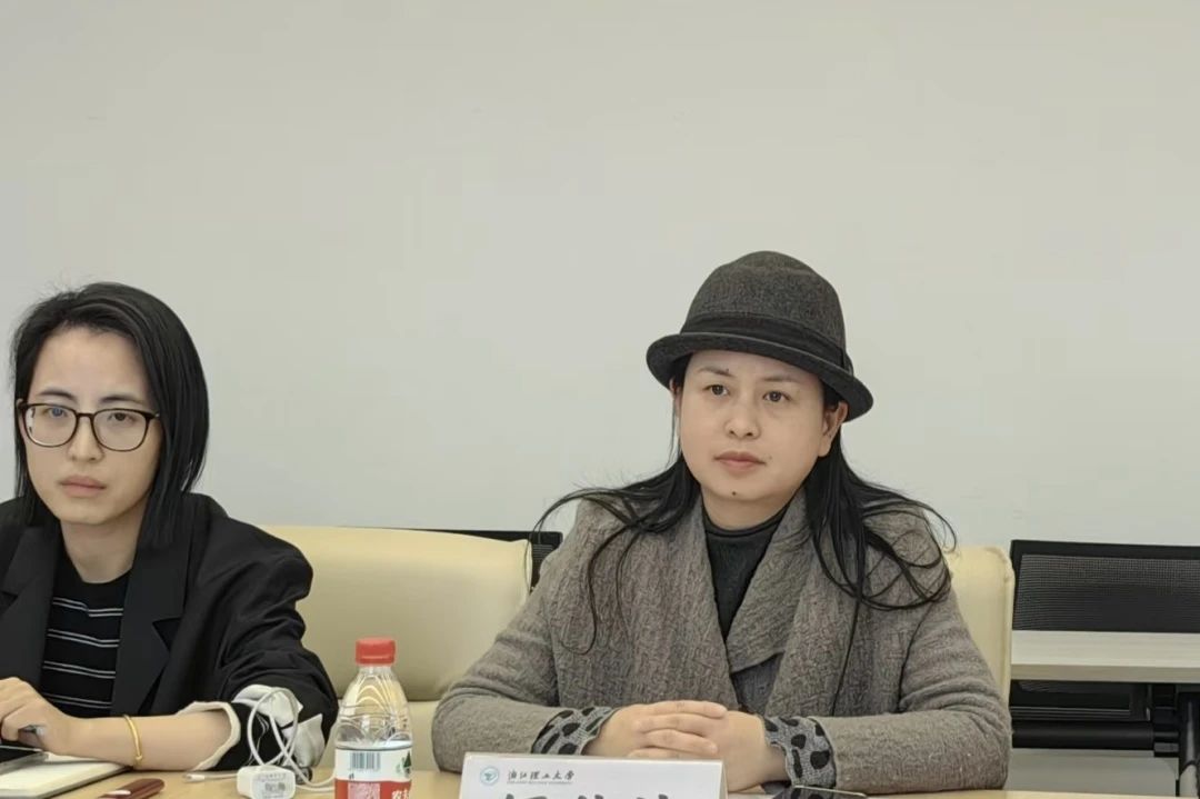 参观结束后,在7-555会议室举行中意国际交流座谈会,座谈会由服装学院副院长须秋洁主持。服装学院教科办主任周政子、艺术与科技系副主任金曾可、服装设计基础实验室主任贾凤霞、服装与服饰设计系教师祝爱玉、周约玎、服装表演专业教师朱翊叶参加座谈。