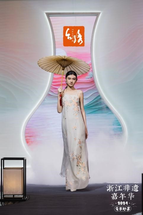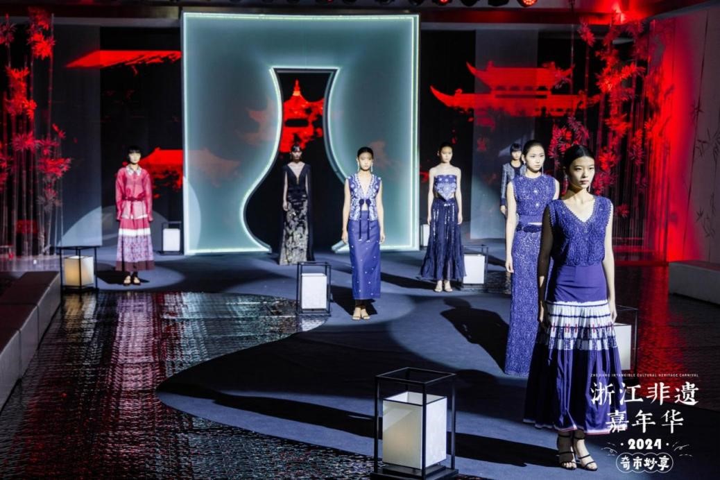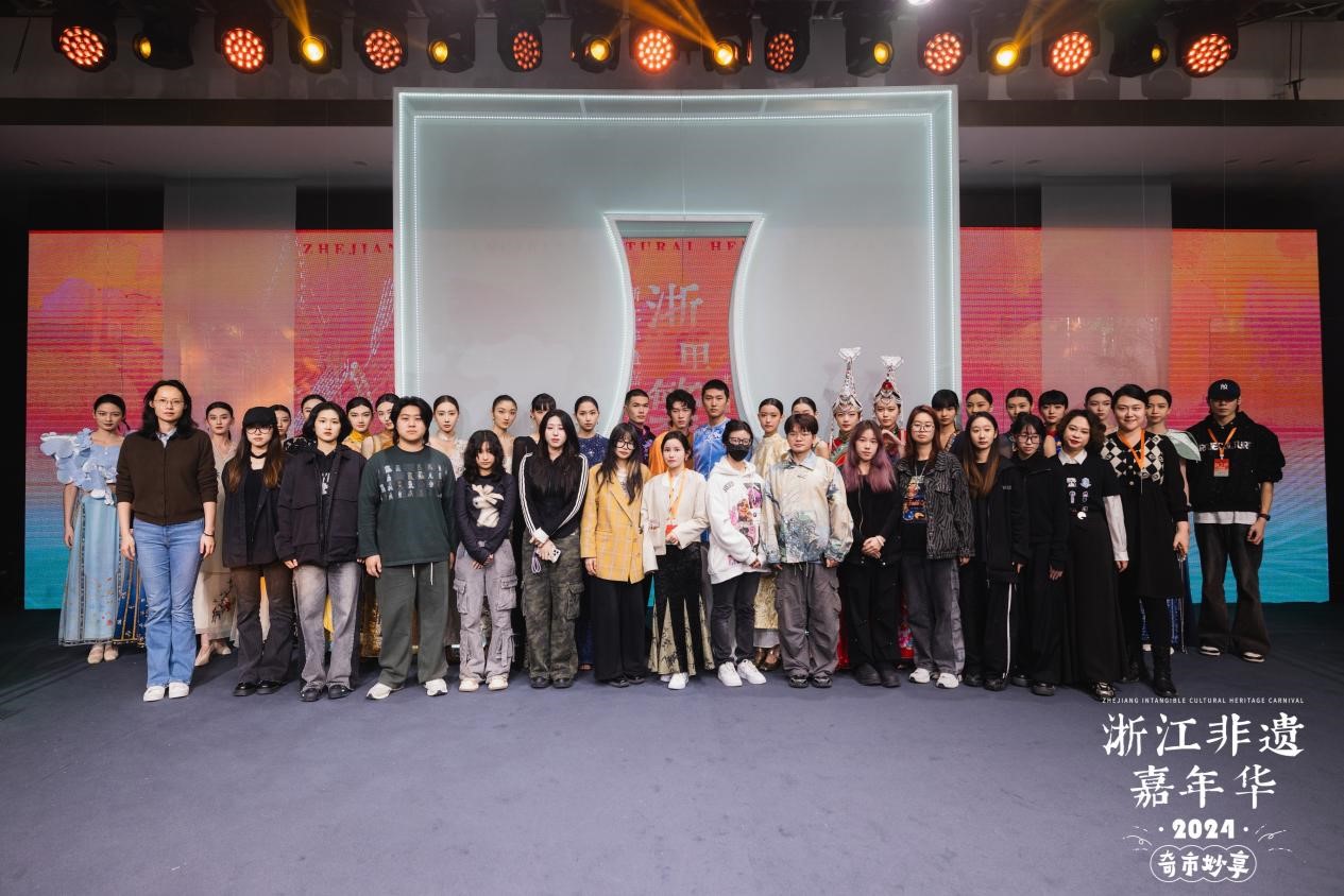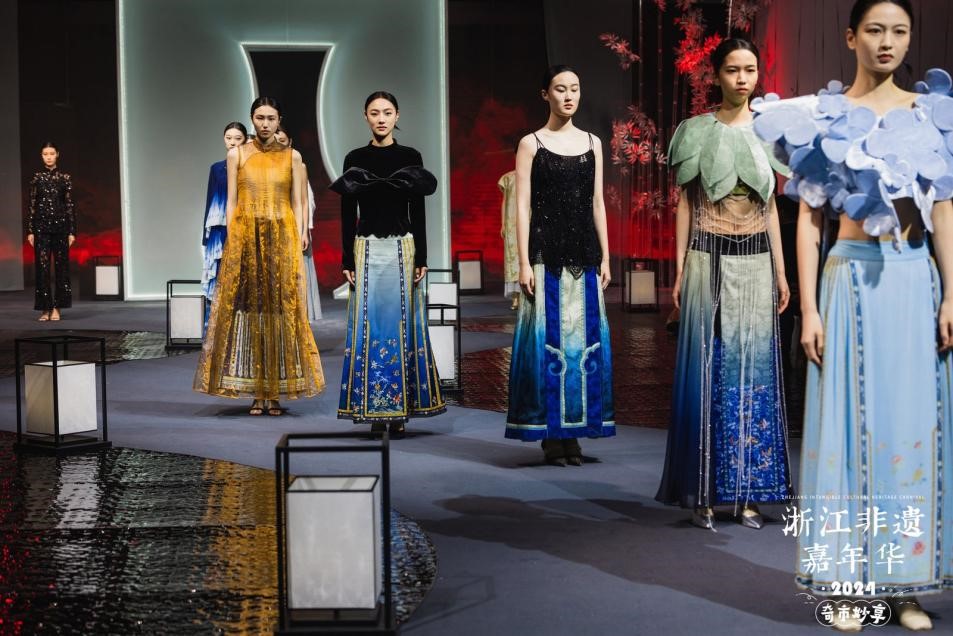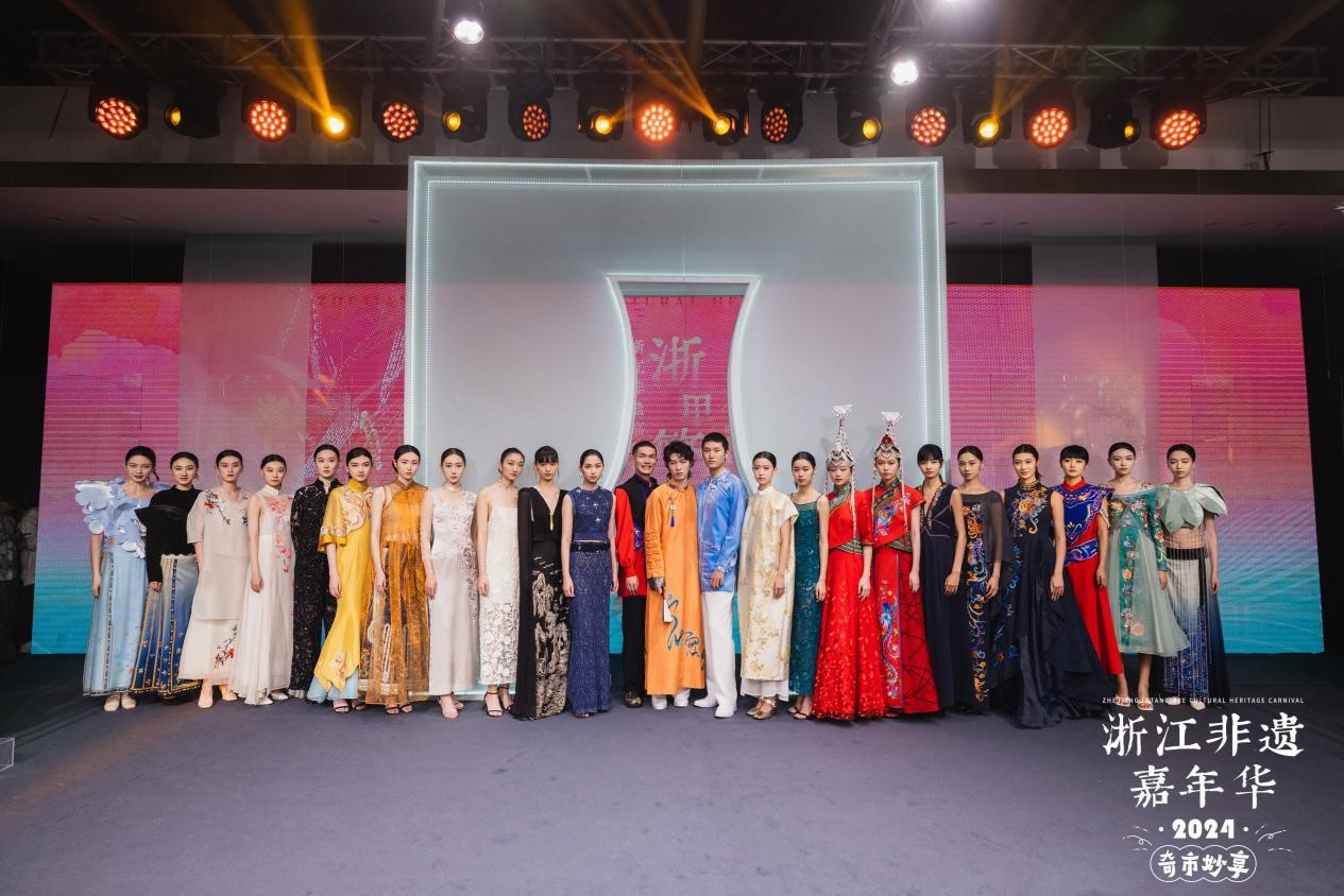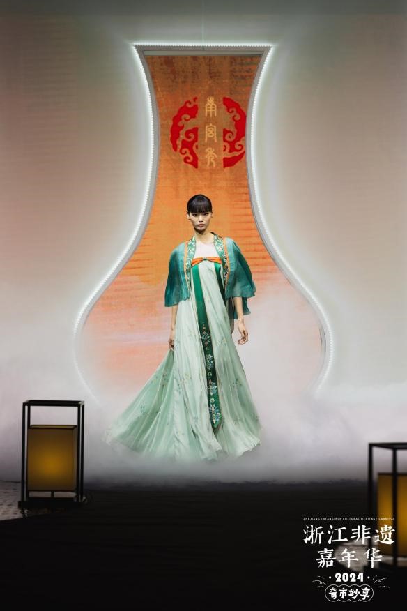 T台秀现场,灯光璀璨,音乐悠扬。一件件非遗服饰,承载着非遗匠人和时尚新生的集体智慧,它们不仅展示了浙江非遗文化的庞大基因与地域风格,更传递了新时代浙江人民对中华优秀传统文化的赓续与创新。