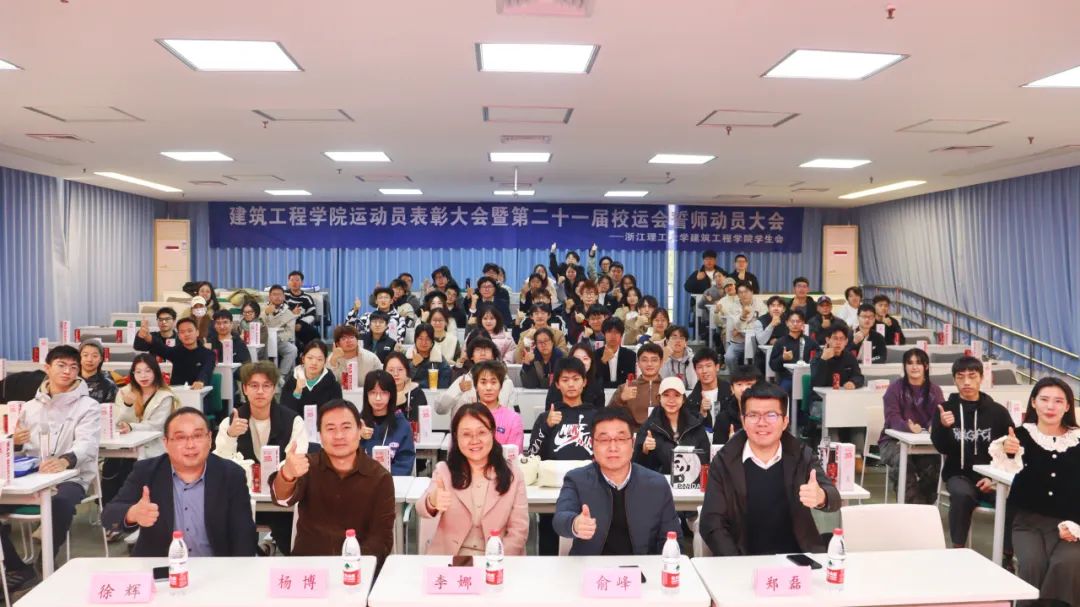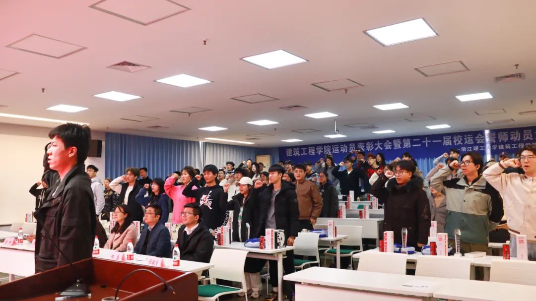 11月27日下午,建筑工程学院在2号楼致远厅举行运动员表彰大会暨第二十一届校运动会誓师动员大会。学院党委书记李娜,执行院长俞峰,副院长刘勇、杨博,党委副书记、纪委书记郑磊,学术副院长徐辉,以及学院辅导员和运动员代表参加了本次大会,会议由学院团委副书记、体育工作指导老师柴燕婷主持。
