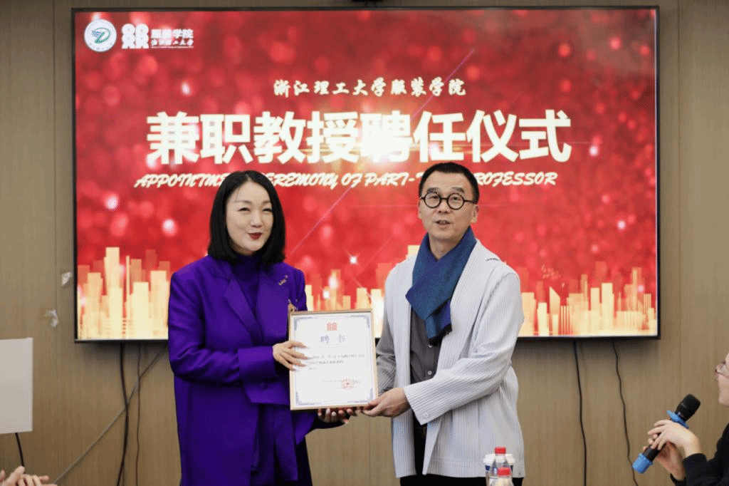 崔院长对盖娅传说熊英设计师团队一行的到来表示热烈欢迎,他表示,熊老师是国际知名设计师,希望此次活动能够搭建传统与时尚相融合的交流平台,同学们能够借助此次活动的机会,多向熊老师讨教将中国优秀传统文化进行转化的先进经验。在沙龙活动现场,崔院长为熊英老师颁发了浙江理工大学服装学院产教融合兼职教授。
