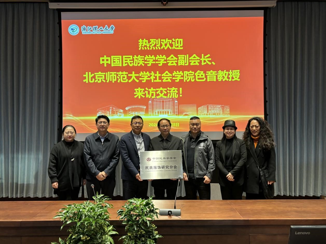 11月28日下午,由中国民族学学会、浙江理工大学服装学院主办,浙江理工大学服装学院、中国民族学学会民族服饰研究分会承办,《丝绸》杂志社、浙江省哲学社会科学规划领军人才培育专项课题“中华传统纺织服饰造物设计体系与文献研究”、浙江省丝绸与时尚文化研究中心提供学术支持的“费孝通学术思想&中华丝绸文明”特邀讲座在浙江理工大学临平校区蚕学馆顺利举行。本次讲座特邀北京师范大学色音教授主讲,由服装学院夏帆教授主持、服装学院党委书记熊杰教授贺词,《丝绸》杂志社李启正社长、服装学院副院长须秋洁教授、服装学院陈敬玉教授、李欣华副教授、青年骨干教师朱翊叶博士以及各系部专任教师和研究生代表参加了本次会议。