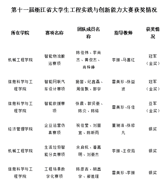 近日,第十一届浙江省大学生工程实践与创新能力大赛获奖名单公布,我校的该项竞赛由机械工程学院组织,理工学子们凭借深厚的专业知识、出色的现场应变能力和卓越的团队协作精神,一路过关斩将,最终荣获3金3银6铜的辉煌成绩。