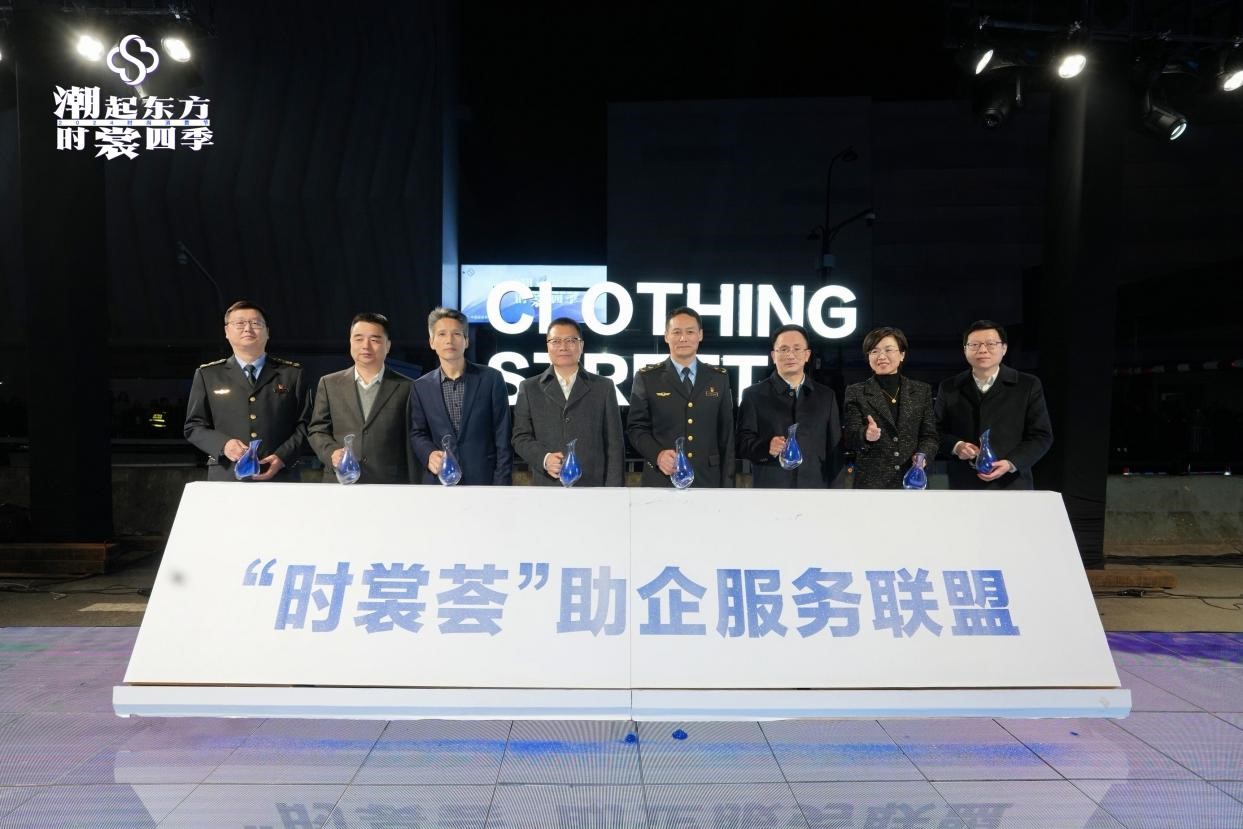在“时裳荟”服务联盟发布环节,杭州市行政审批服务管理办公室党组书记、主任李炜,杭州市委直属机关工委委员、二级巡视员周华清,杭州市市场监督管理局党委委员、二级巡视员王建文,杭州市商务局党组成员、副局长吴来恩,上城区委直属机关工委常务副书记许康波,上城区商务局党委书记、局长周邱忆,上城区行政审批服务管理办公室党组副书记、主任陈一春,上城区市场监督管理局党委委员、副局长徐烽良上台共同启动。该联盟的成立旨在整合各方资源,为时尚企业提供全方位的服务与支持,助力企业解决发展过程中遇到的问题,推动时尚产业的协同发展。