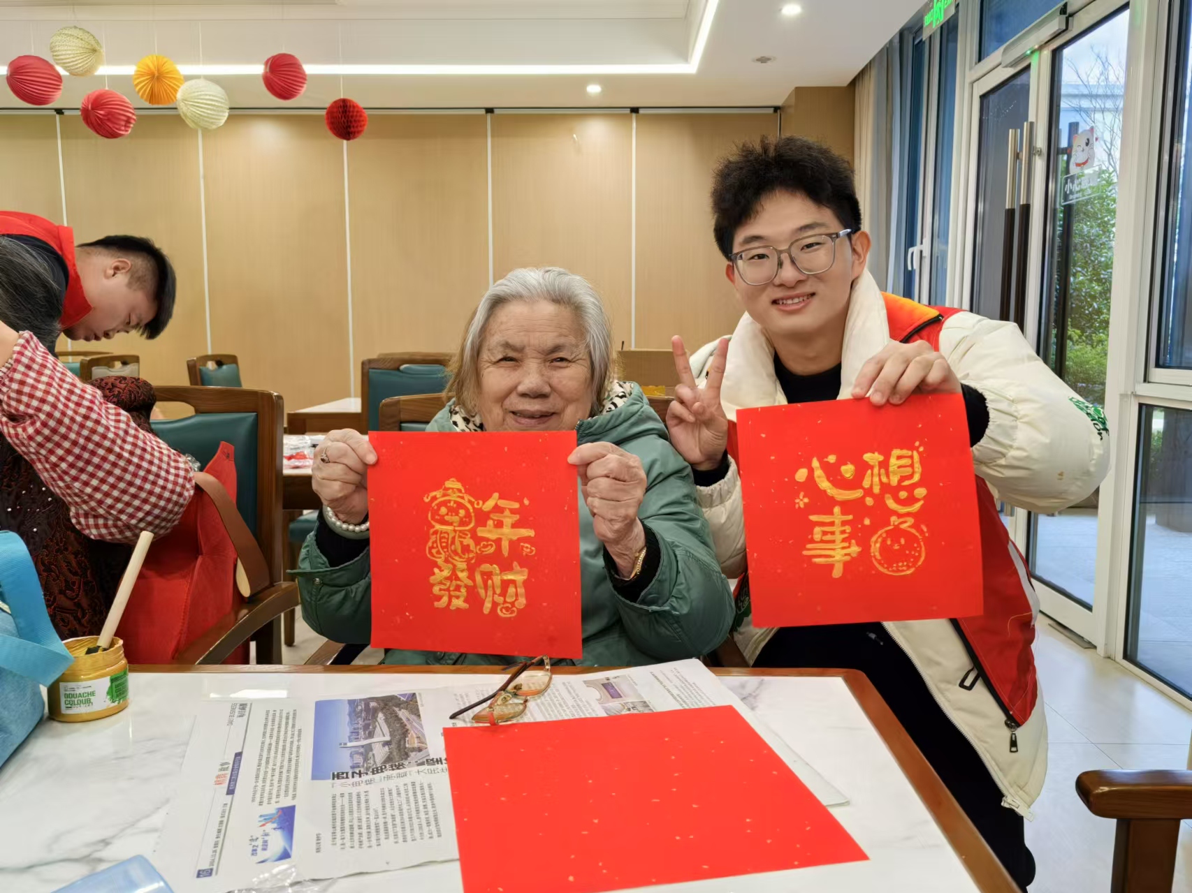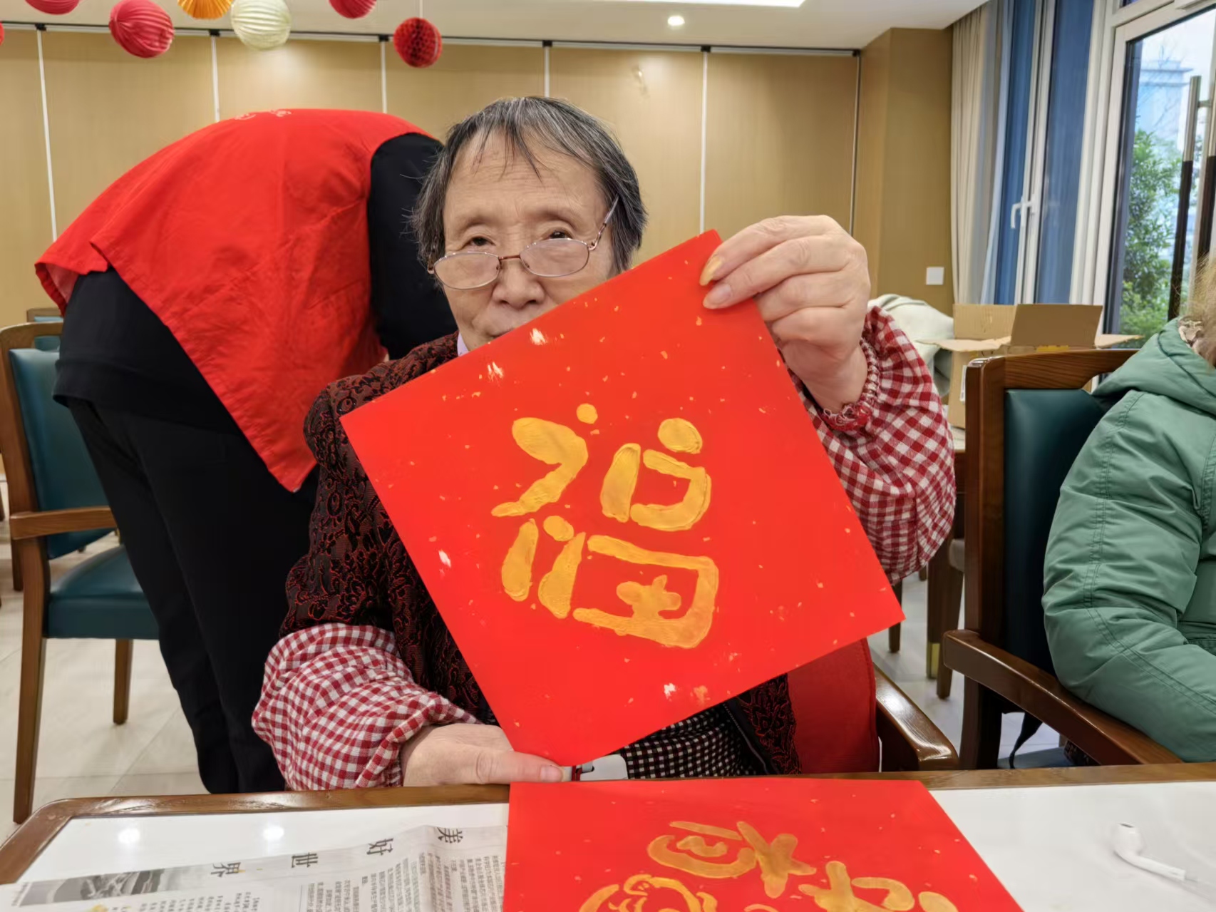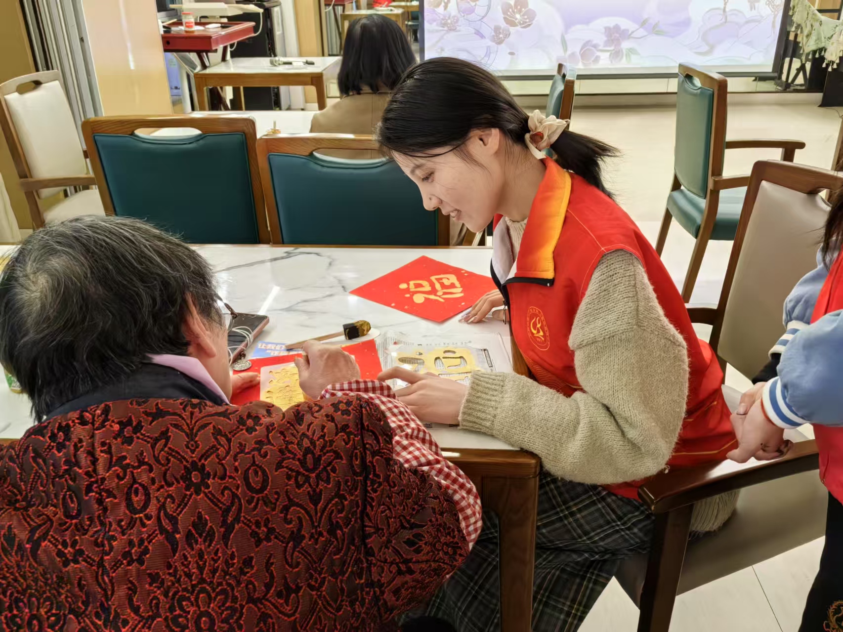 除了防诈骗知识讲座外,“三丝”励志服务队还为长者们带来了一场充满传统文化韵味的拓印“福”字活动。志愿者们向长者们介绍了拓印这一传统技艺的历史渊源和文化内涵,并亲手指导他们如何制作拓印作品。在志愿者的帮助下,长者们拿起刻刀和纸张,一笔一划地雕刻着属于自己的“福”字。这一过程中,长者们不仅感受到了传统文化的魅力,更在亲手制作的过程中体会到了成就感和幸福感。