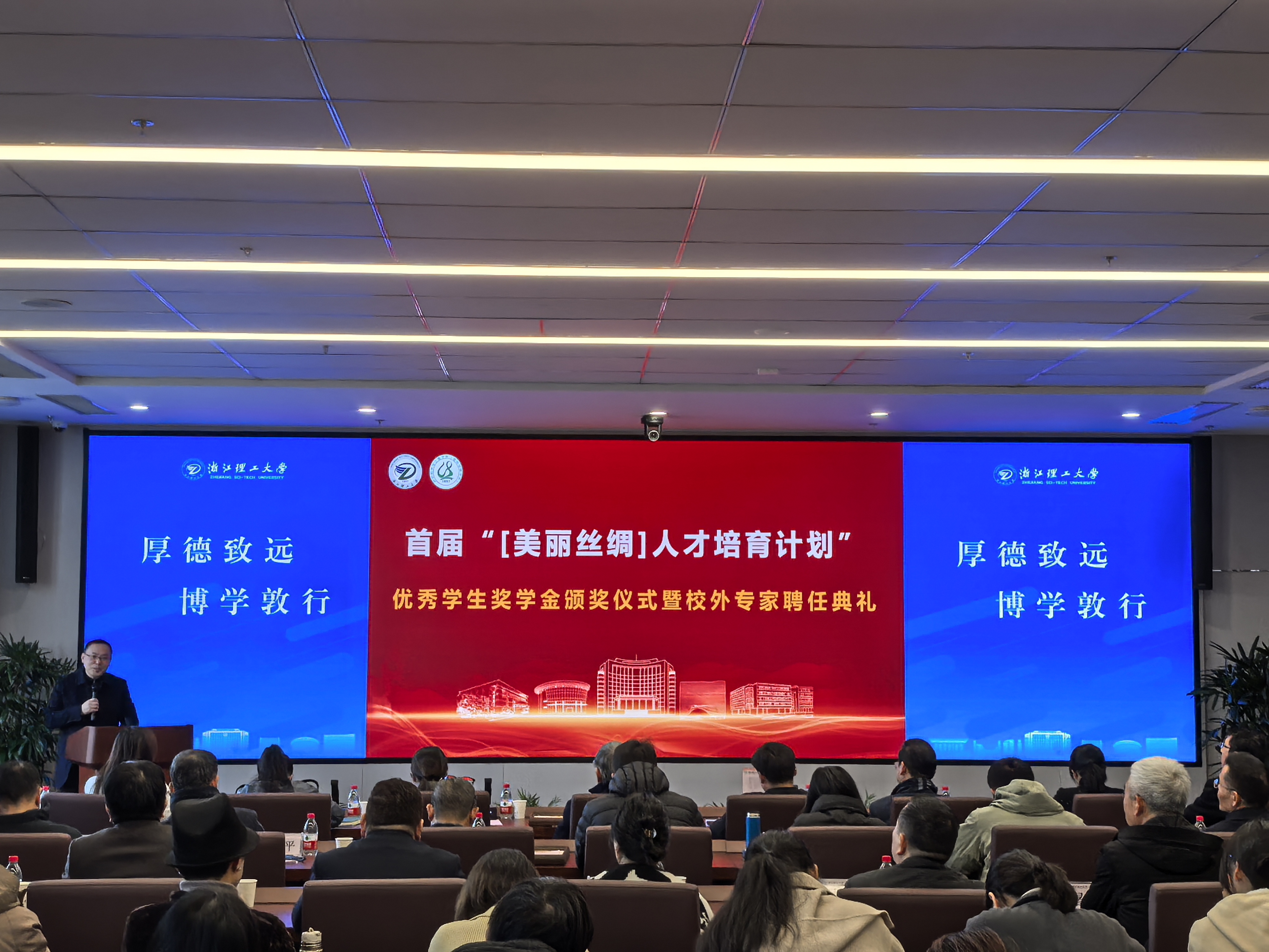 1月9日上午,由纺织(丝绸)学院和《丝绸》杂志社主办的首届“[美丽丝绸]人才培育计划”优秀学生表彰大会暨校外导师聘任仪式在浙江理工大学尚+大楼310报告厅隆重举行。校党委委员、副校长陈爱喜,浙江理工大学丝绸公益发展基金发起人费建明、顾新荣先生,《丝绸》杂志社、全国丝绸信息中心负责人,丝绸设计与工程专业校外专家、企业导师,校友企业代表,相关职能部门领导、纺织(丝绸)学院全体领导班子以及师生代表参加会议。仪式由纺织(丝绸)学院院长于斌主持。