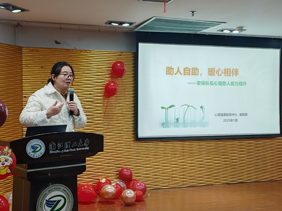 新春团拜会前,举行了安全保卫工作技能培训。校心理健康教育中心主任浦晓黎老师以《助人自助 暖心相伴——安保队伍心理助人能力提升》为题,结合自己多年的工作经历,用案例讲解了安保队伍如何在工作中开展心理助人。全体安保人受益匪浅,深受启发。