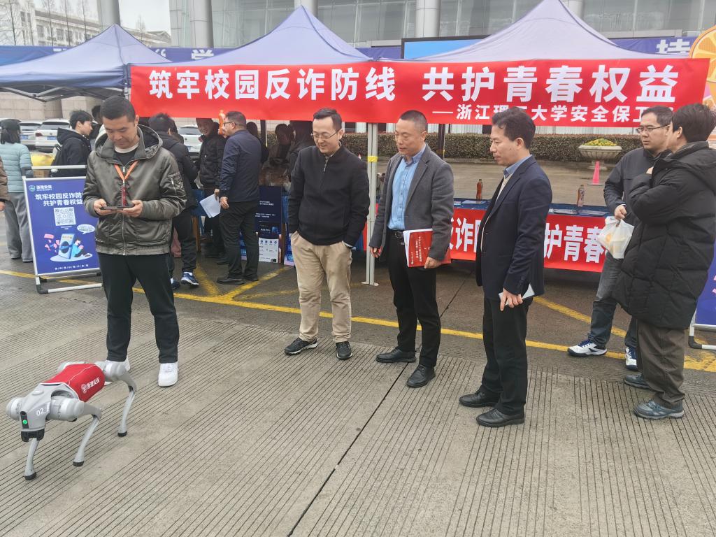 值得关注的是,安全保卫部的一员——智能机器狗平平吸引了众多目光。这只“科技尖兵”不仅能进行反诈语音播报,还能进行各种动态演示。机械工程学院王同学表示:“这种沉浸式体验让原本枯燥的反诈知识变得生动易懂。”