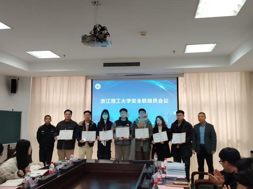会议对2024年度校园安全工作中表现突出的先进个人授予“浙理守护之星”荣誉称号,李孝明和黎舒卫为获奖者颁奖,表彰他们在治安反诈、隐患排查、应急处突等方面的积极贡献。