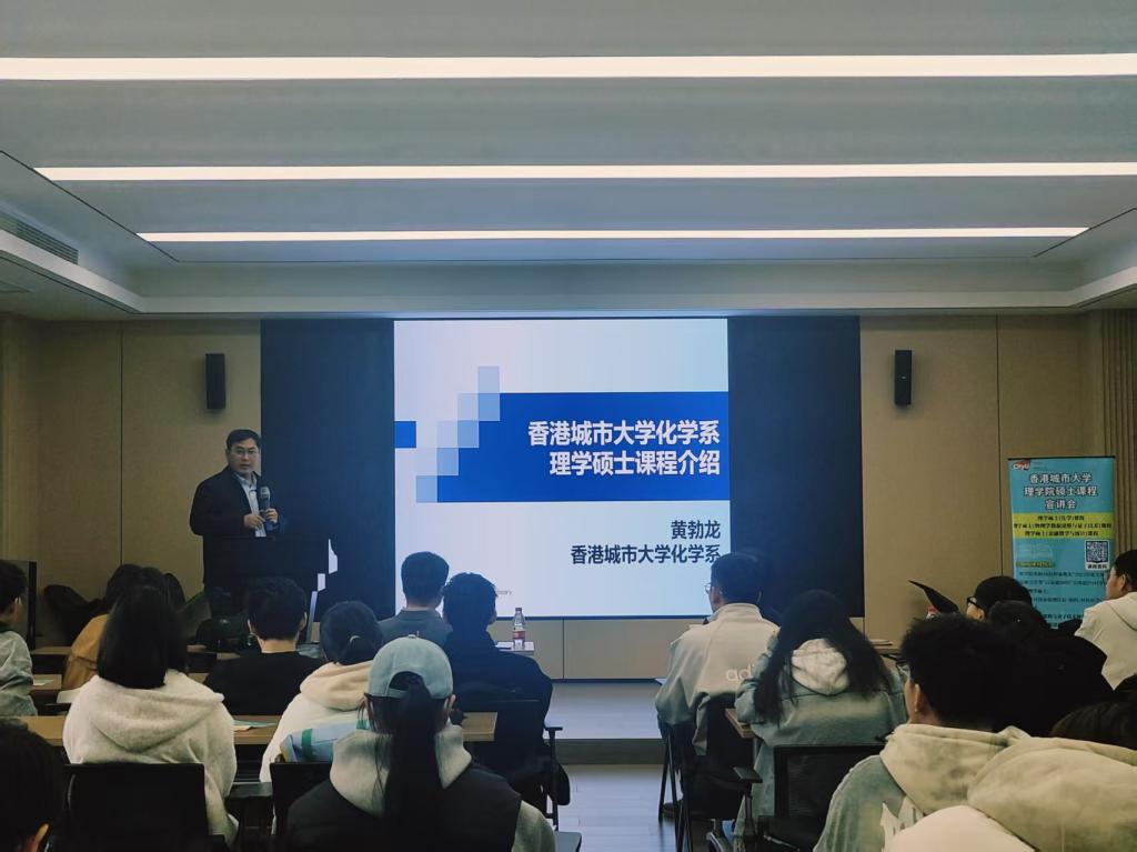 左彪对李丹枫一行的到来表示欢迎,也向同学们分享了自己在香港城市大学访学的经历。李丹枫为大家播放港城大的宣传片,随后介绍了香港城市大学的环境、学习与科研氛围、人才培养、政策等,欢迎同学们报考港城大研究生。黄勃龙向同学们介绍了化学系理学硕士的课程、师资力量、仪器与国家重点实验室等。柴愚介绍了物理系的硕士课程结构、申请方式与流程等。