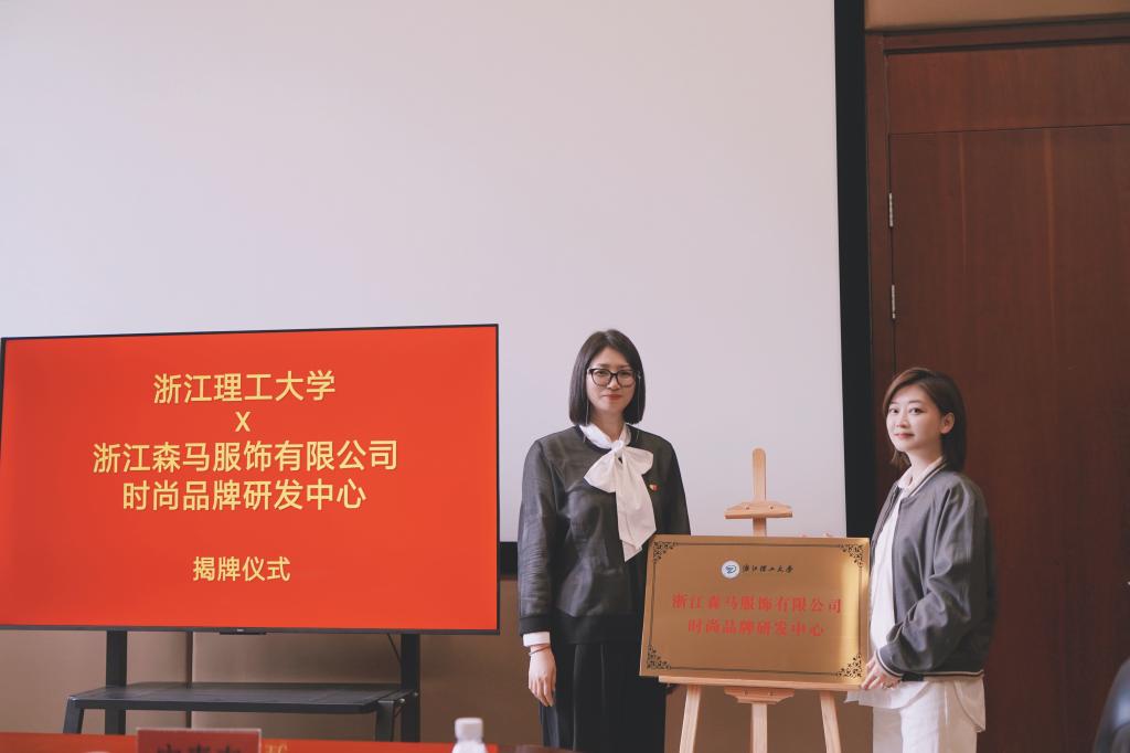 周伟与王希耀共同为时尚研发中心揭牌。王希耀回顾了森马与服装学院在产品设计研发、时尚校园行传播、时尚营销模式探索等产教融合和人才培养活动中取得的成果。她希望未来能与服装学院在设计研发、时尚传播、数智时尚等领域开展更广泛的合作。森马将全力支持服装学院的人才培养与就业工作,组织企业导师进校指导,为学生提供更多实习和就业机会。