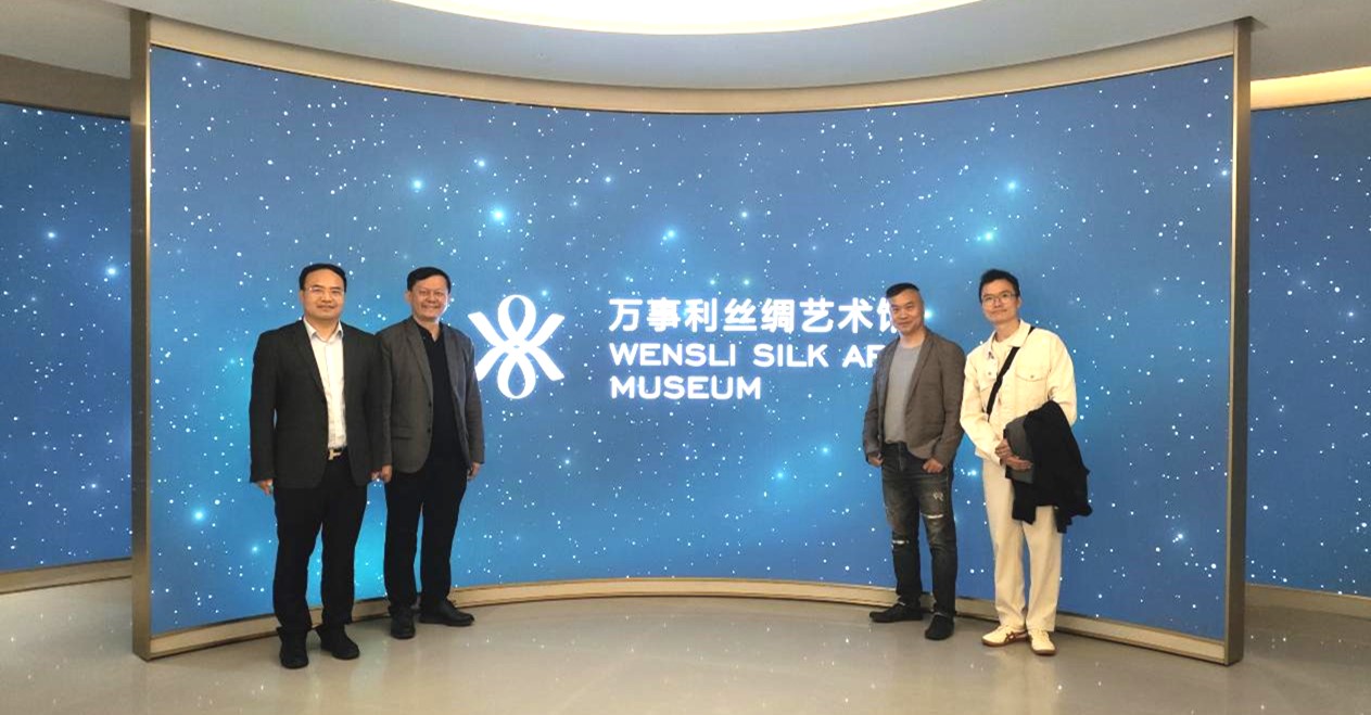 第二站为万事利科创中心丝绸艺术馆,集团公司副总滕俊凯系统介绍了企业从传统丝绸作坊到现代化产业集团的发展历程,着重介绍“文化+科技”双轮驱动战略,体现了传统工艺与尖端科技的深度融合。调研组观摩了企业自主研发的AI纹样设计系统、航天级阻燃丝绸面料、可降解丝蛋白医用材料等跨界创新成果。