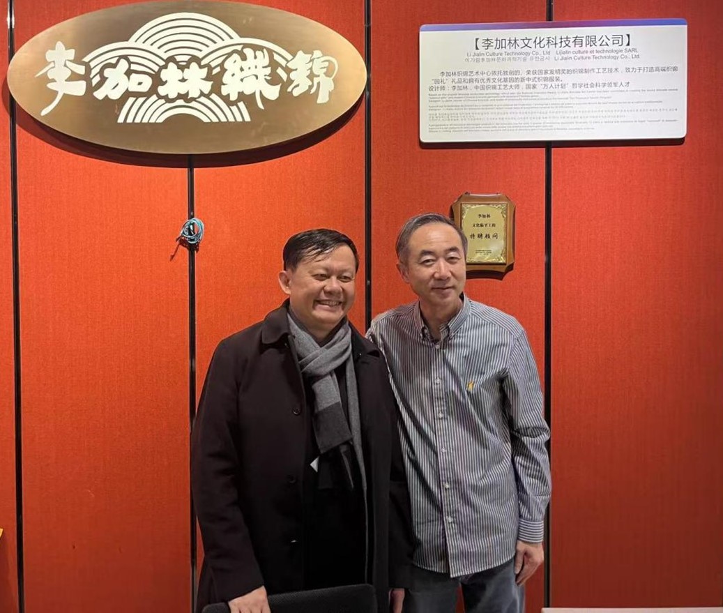 第三站李加林织锦艺术馆,李加林教授亲自为调研组讲解织锦艺术的核心特色与创作理念。他以馆藏织锦画为例,解析数码提花技术如何通过经纬交织实现3500种色彩层次的艺术表达,突破传统织锦的色域限制,详细介绍了传统织锦技艺的当代转化路径。