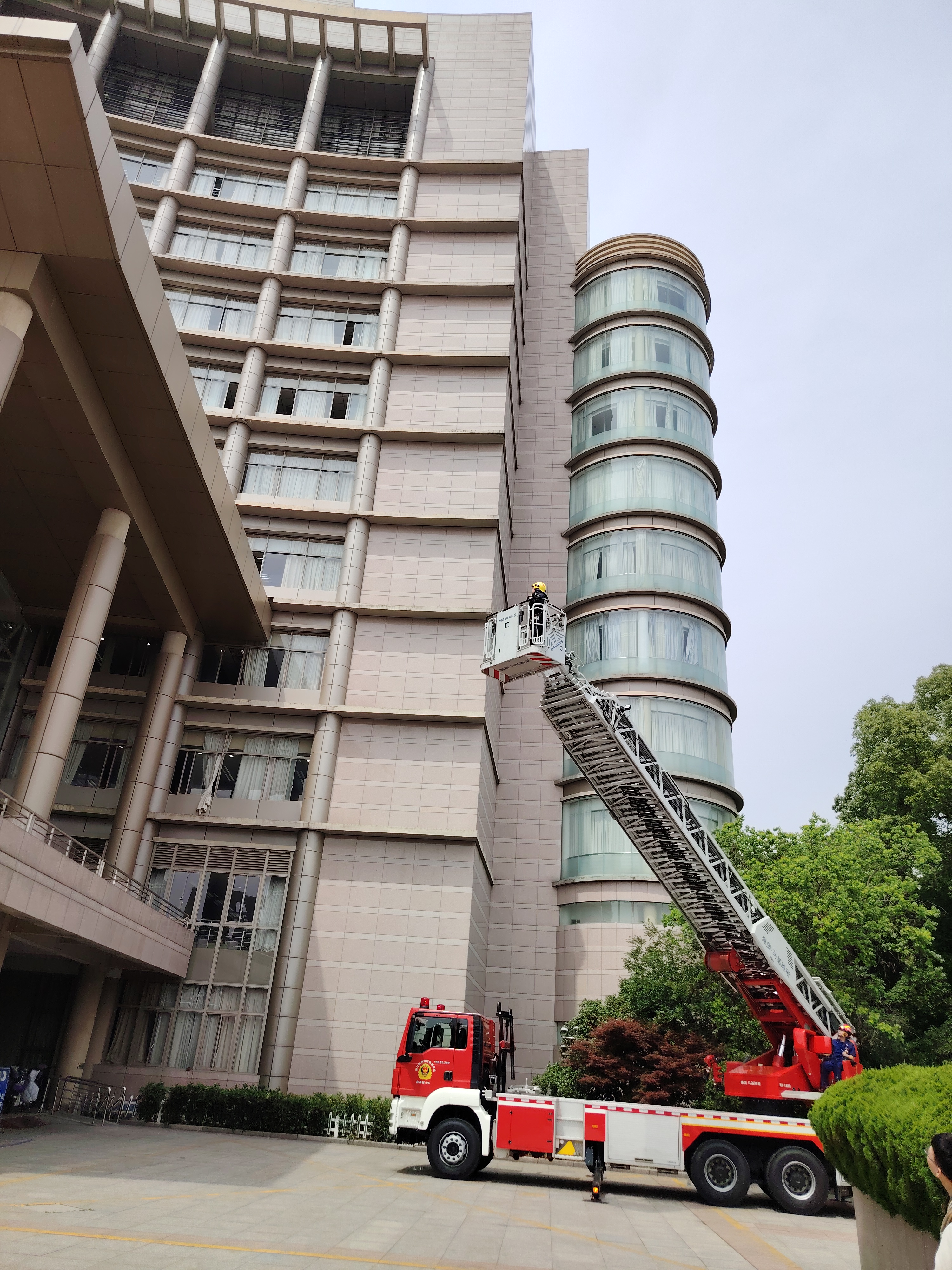 一名学生被困五楼天台,消防云梯车到达现场“空中救人”,医务人员就近设立临时救护站,对被救学生进行心肺复苏,并在现场进行心肺复苏培训。