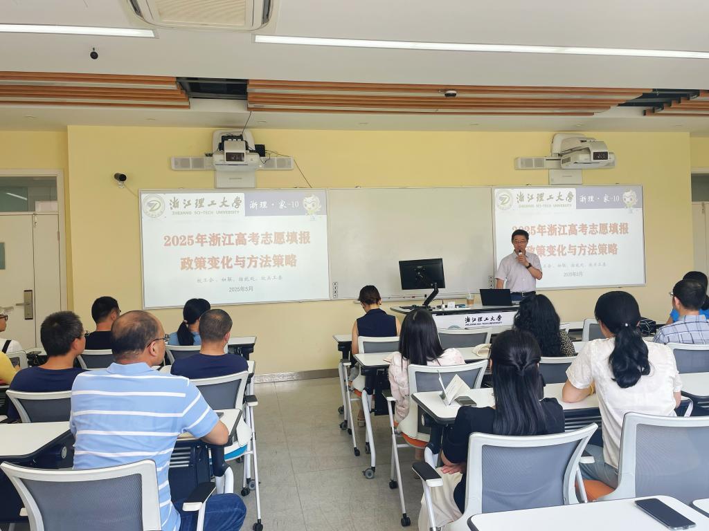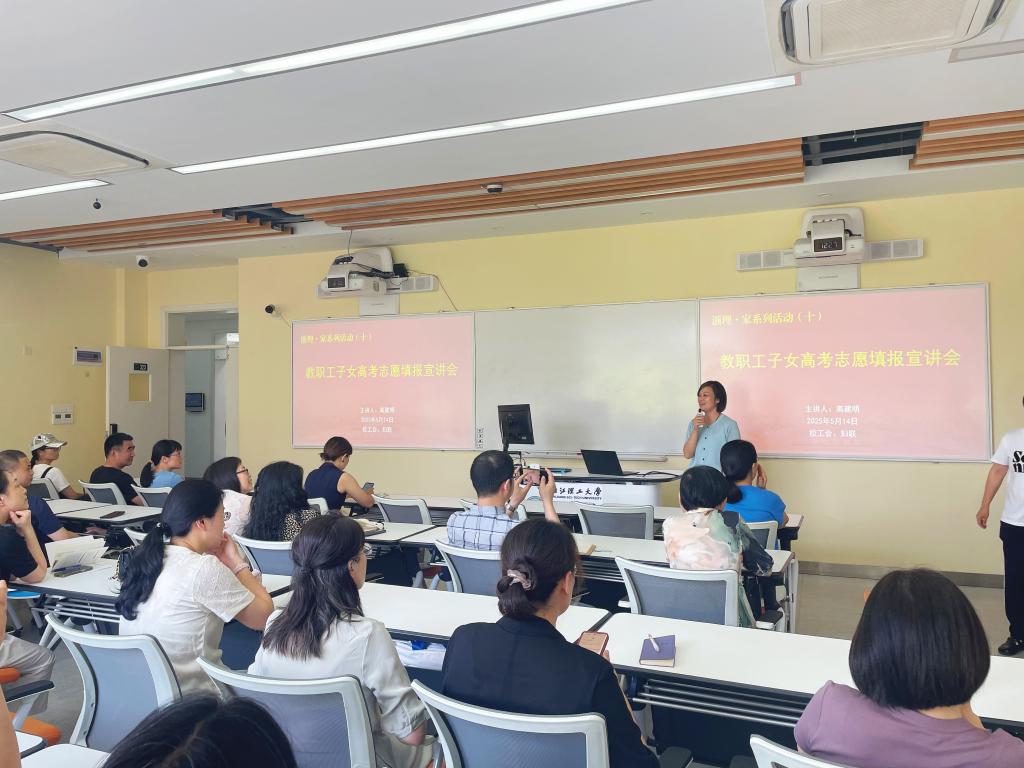 不负凌云志,扬帆正启航。高考在即,为积极落实“我为群众办实事”,帮助广大教职工全面了解2025年浙江省高考志愿填报与录取政策、志愿填报策略等,助力孩子如愿进入心仪高校,由校工会、妇联,招生与就业指导处以及校关心下一代工作委员会联合组织的“浙江2025高考志愿填报辅导讲座”,于5月14日中午,在下沙校区2-S323智慧教室如期举行。临平校区L4—416教室同步直播。
