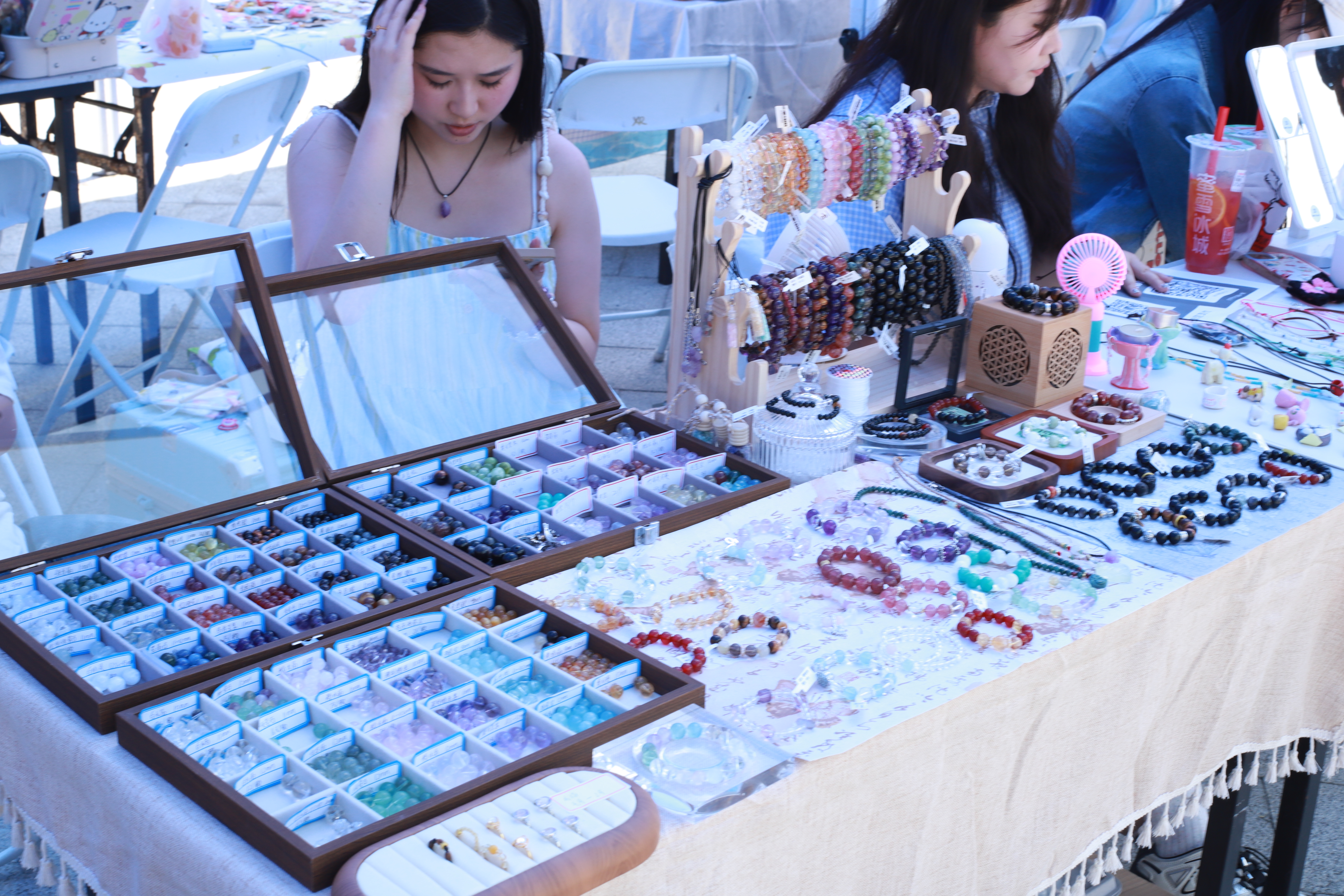 开幕式结束后,创新创业品牌集市正式开业!53个各式创意摊位依次亮相手作坊、校园文创、发饰小屋等,服院学子们化身摊主,带着自己精心打磨的创意作品参与到这场充满活力的夏日盛会中。