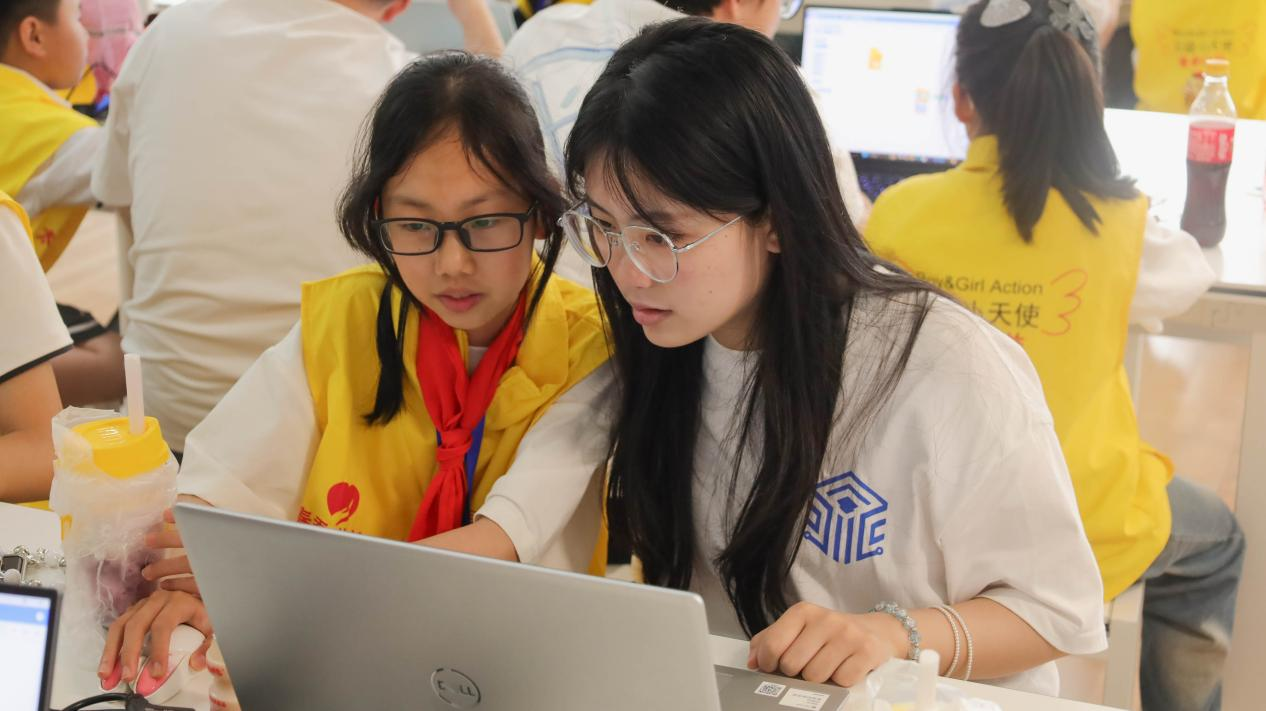 在涂鸦智能实验室,孩子们在志愿者帮扶下完成Scratch作品。从最初的好奇懵懂,到逐渐掌握操作技巧,孩子们的眼中闪烁着智慧的光芒。他们充分发挥想象力,编写代码,创造出一个个独特的小游戏,让代码成为传递希望的载体。