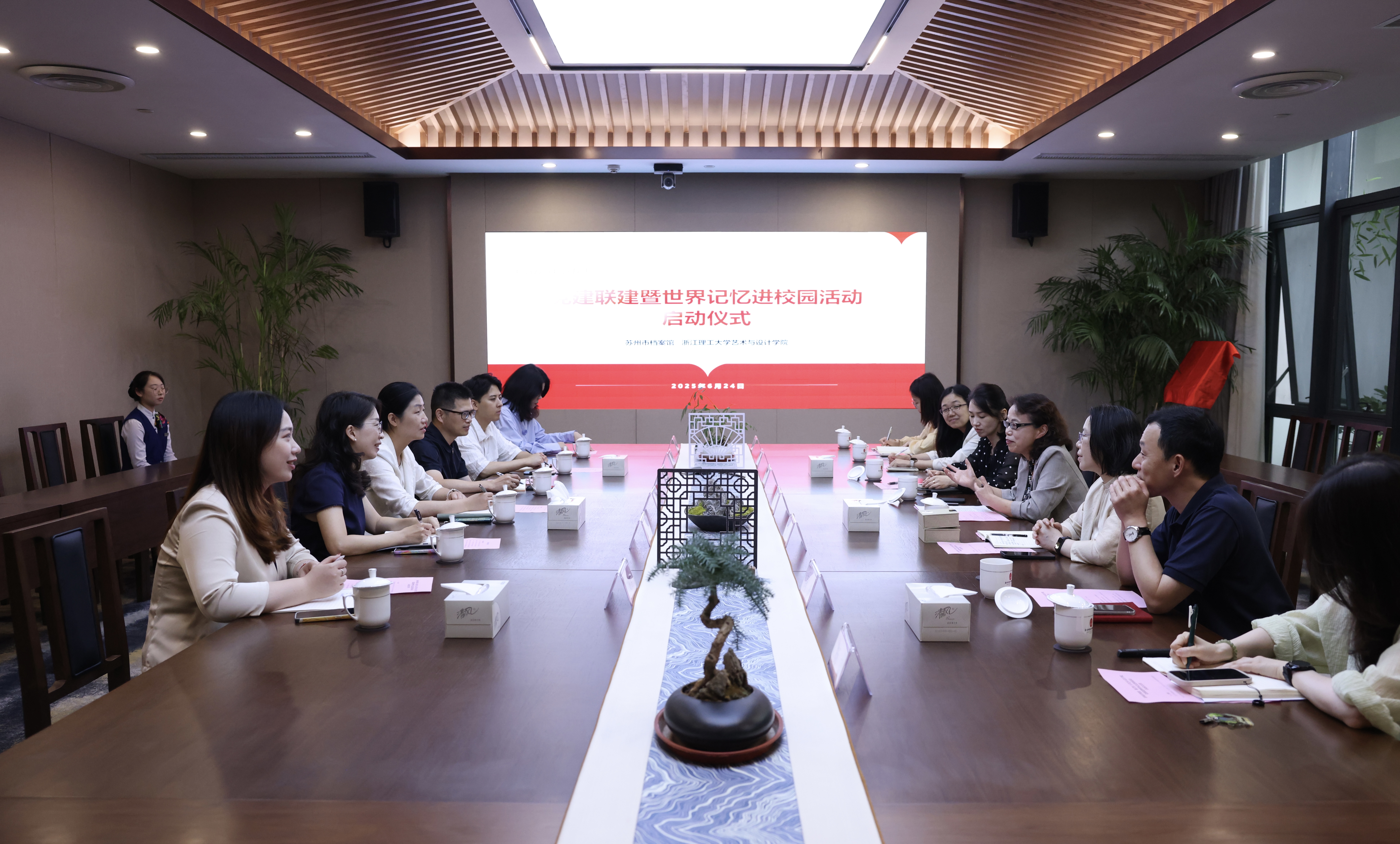 为庆祝中国共产党成立104周年,深入学习贯彻习近平新时代中国特色社会主义思想,加强党建引领,深化校馆合作,6月24日,浙江理工大学艺术与设计学院与苏州市档案馆举行党建联建暨世界记忆进校园活动启动仪式。苏州市档案馆馆长康岚,苏州市档案馆副馆长、机关党委书记贾莉,苏州市档案馆机关党委副书记周济,浙江理工大学艺术与设计学院党委书记吕旻,党委副书记阮财斌,党委委员高宁,专职组织员赵伟楠,团委副书记陈妍吉等参加活动。仪式由苏州市档案馆副馆长、苏州中国丝绸档案馆馆长谢静主持。