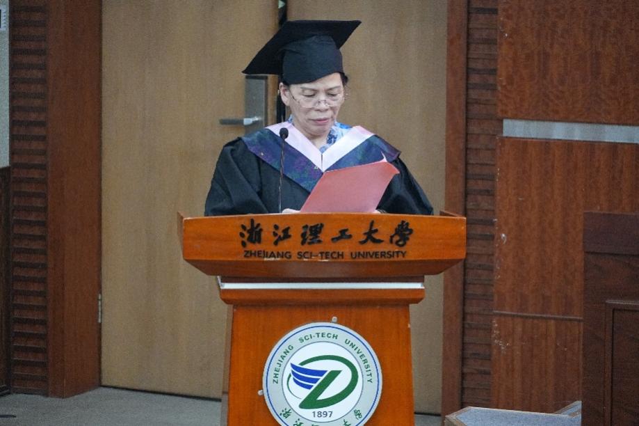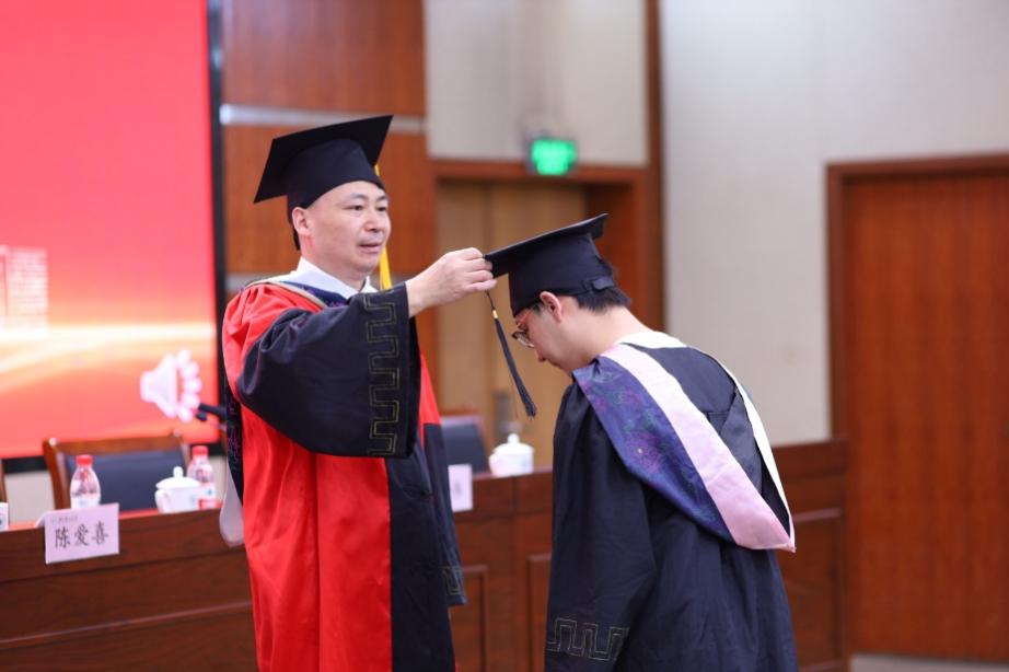 典礼最后举行了学位授予仪式,陈爱喜为学士学位获得者扶正流苏、颁发学位证书。