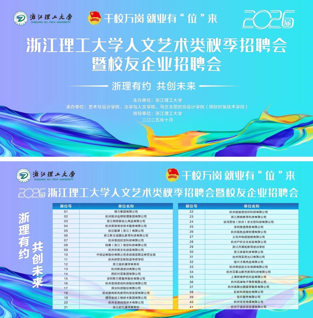 10月15日,由马兰戈尼时尚设计学院(国际时装技术学院)联合艺术与设计学院、法学与人文学院共同主办的“2026届浙江理工大学人文艺术类秋季招聘会暨校友企业招聘会”在临平校区图书馆成功举行。