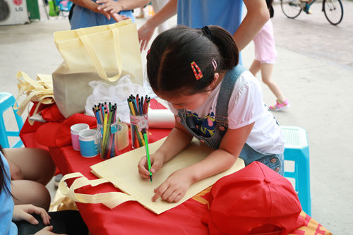 当天下午,小区还可以看到美丽的景象:用蓝色勾勒出清澈的河流,涂鸦出碧蓝的天,再用白色描绘出柔软的白云,最后为这幅画卷添上吸引眼球的绿意,好一片令人向往的水云天!原来,这是居民们在教小朋友在环保袋上作画。他们在画自己理想中的云水社区,画心中的美丽浙江。文化需要传承,节能减排的意识更需要传承下去,居民们以这样的方式将节能环保的意识教给尚且年幼的下一代,希望碧云天代代相传。