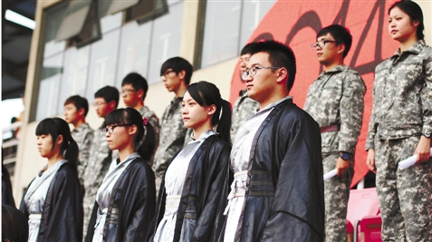“整理着装!”担任经济管理学院军训任务的营长一声令下,全营干脆利落整理身上的军训服。来自工商管理类专业的新生小陈说:“第一次经历这么特别的大学军训,让我们新生感受到了国学特别是古礼的传统魅力。”