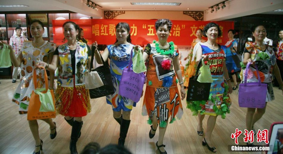 6月27日,在“浙江生态日”来临之际,浙江理工大学服装学院的大学生们利用暑期时间,为杭州洁莲社区的中老年模特队打造了一场另类的时尚盛宴,选用身边的废旧材料制作成时装和手袋,以走秀的形式倡导环保理念。中新社发 李晨韵 摄